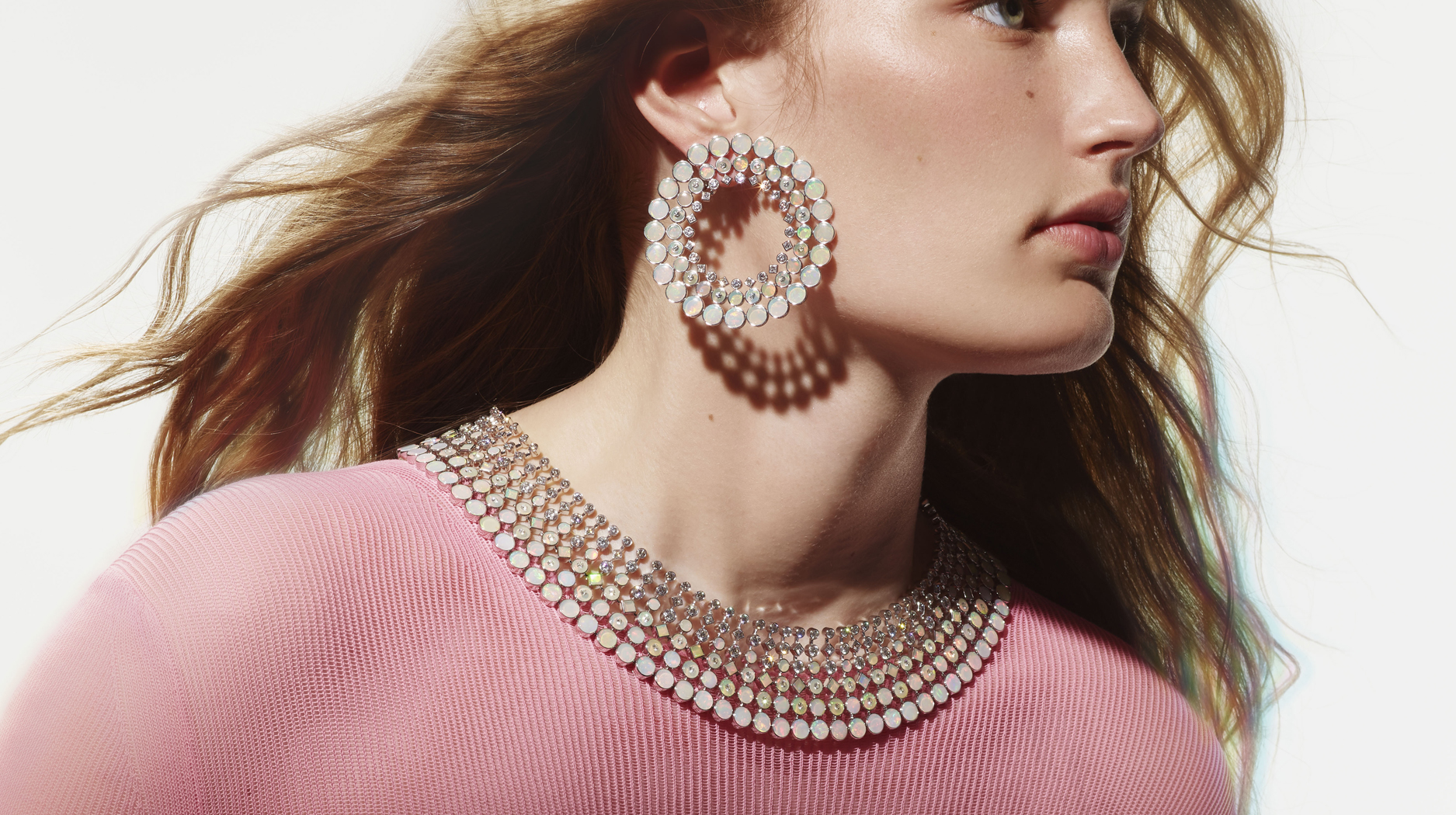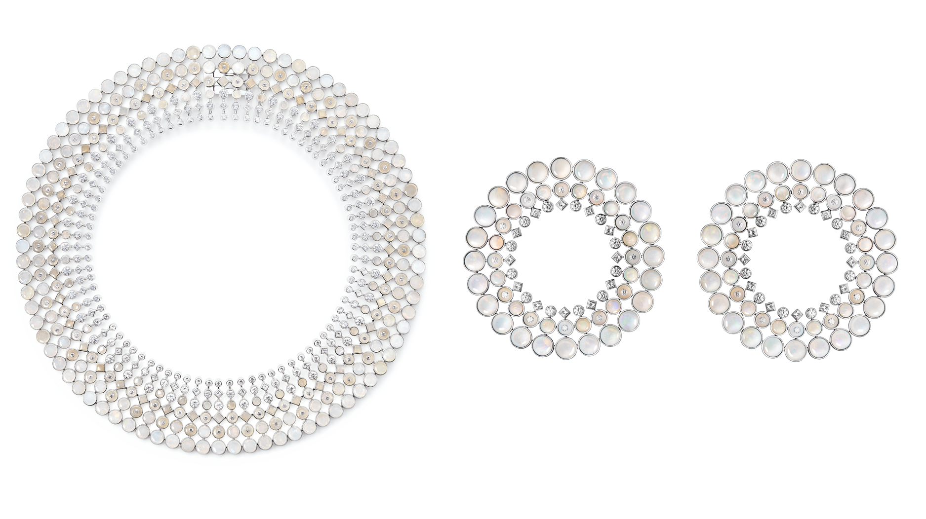 The “Ondes” necklace features opals and diamonds set in white gold. The forward-facing hoops showcase a total 16.14 carats of opals, plus mother-of-pearl and diamonds in white gold.