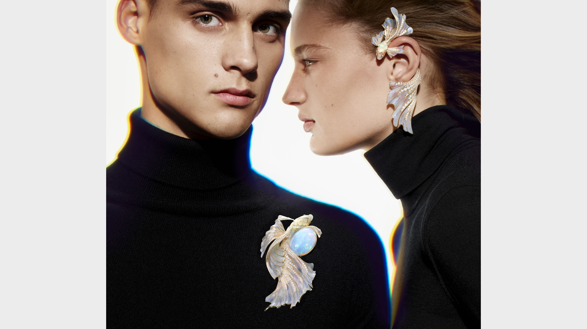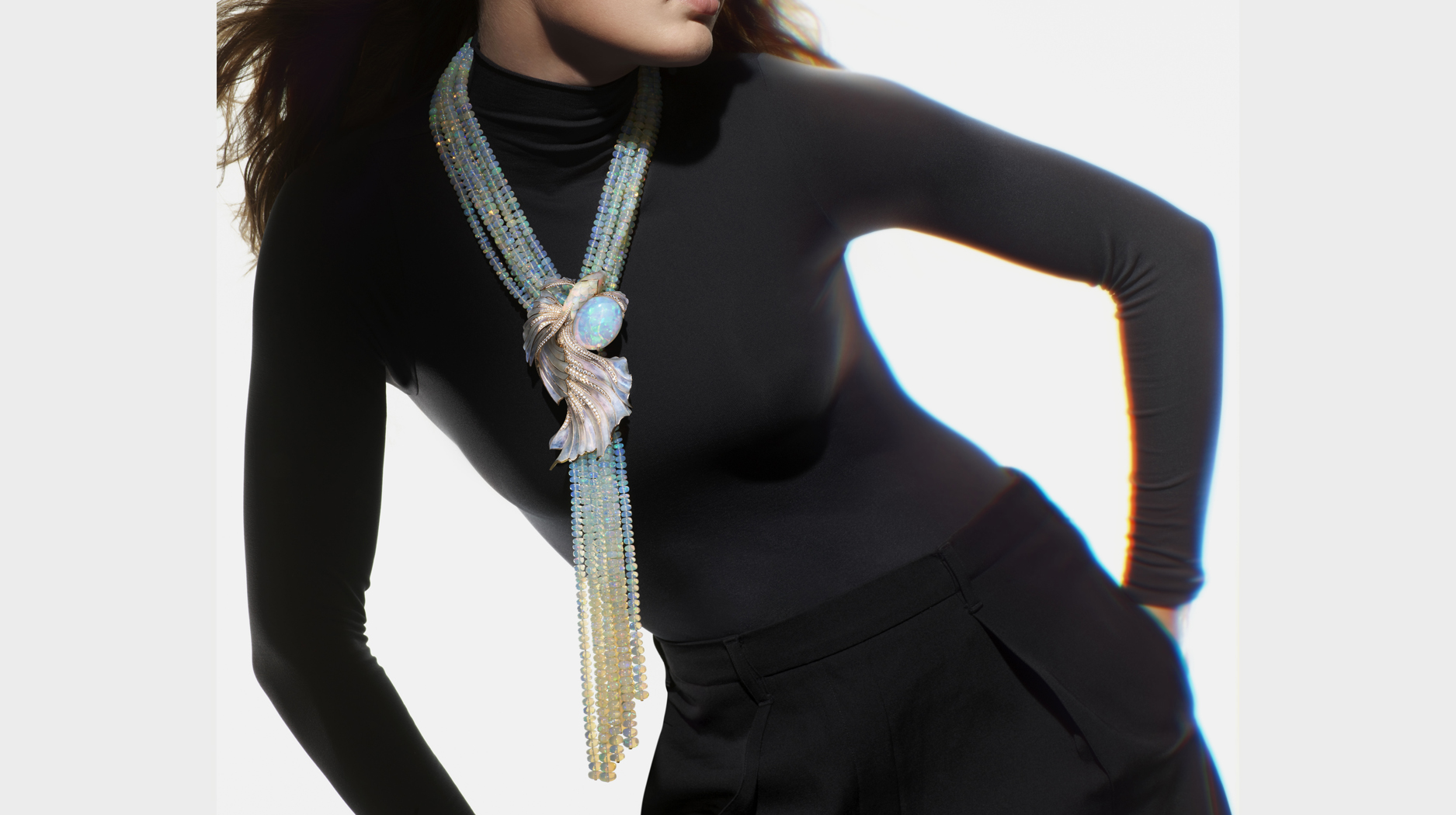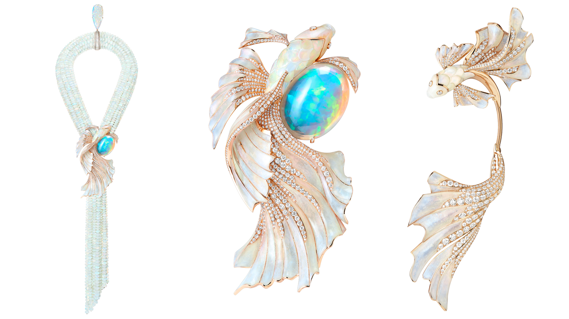 Boucheron’s high jewelry meditation on light’s reflective, transforming properties begins with opals. This multifunctional opal necklace depicts a beta fish and features plique-à-jour enamel on the fins to create a transparent effect.