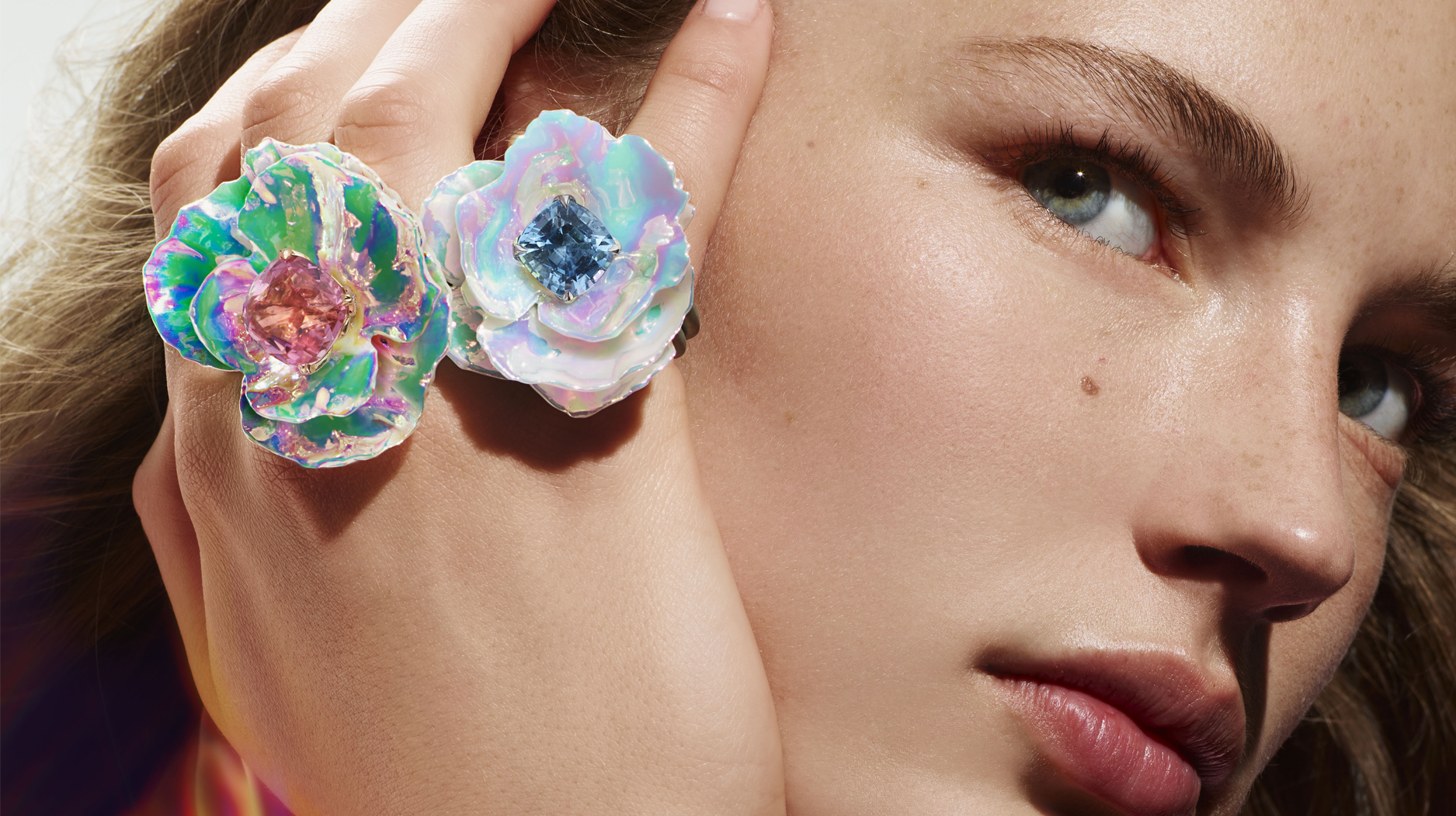 These holographic coatings bring new life to spectacular floral rings and a brooch, dubbed the “Chromatique” set, breathing new life into the nature motif beloved by the jewelry house.