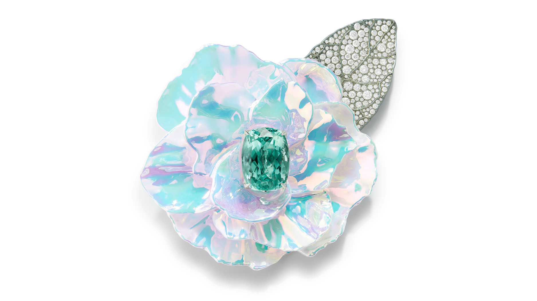 “Chromatique” brooch featuring 25.01-carat cushion-cut green Mozambican tourmaline with holographic ceramic and diamonds set in titanium and white gold