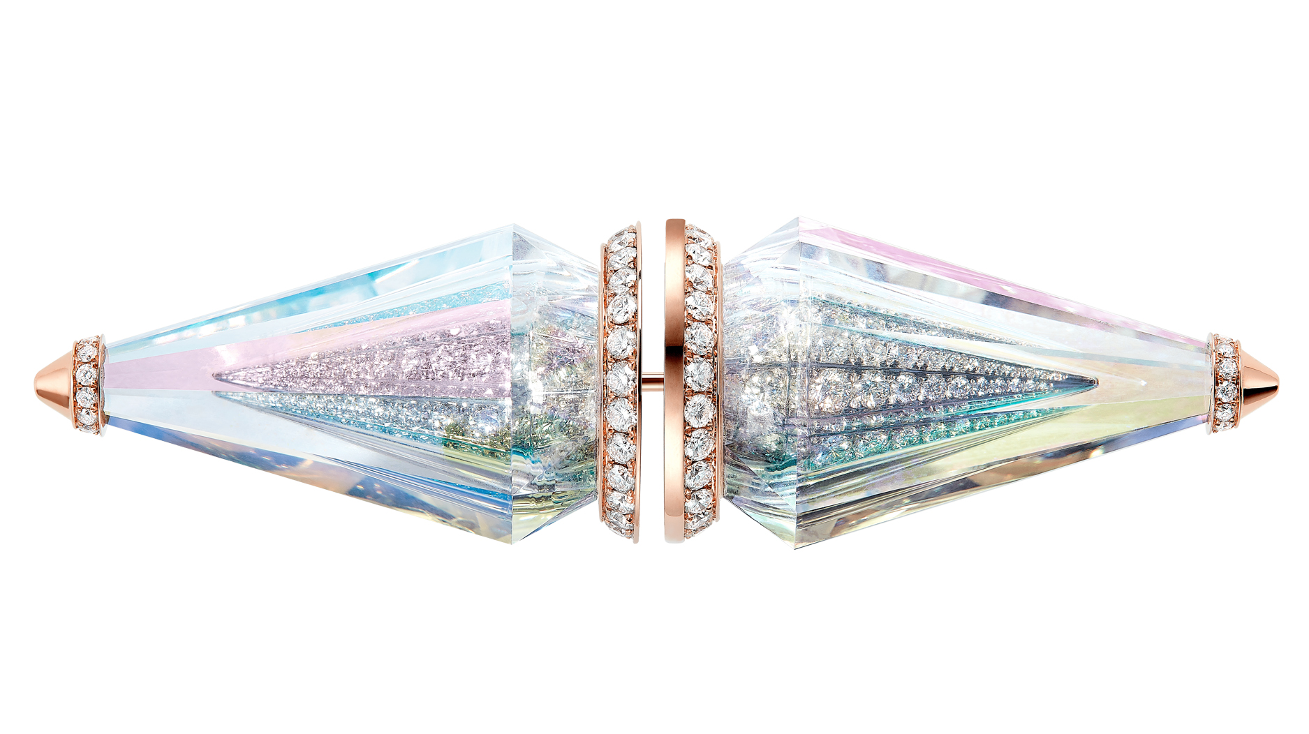 This brooch up close reveals the jewel’s many layers: holographic-coated rock crystal atop a layer of diamonds, all set in pink gold.