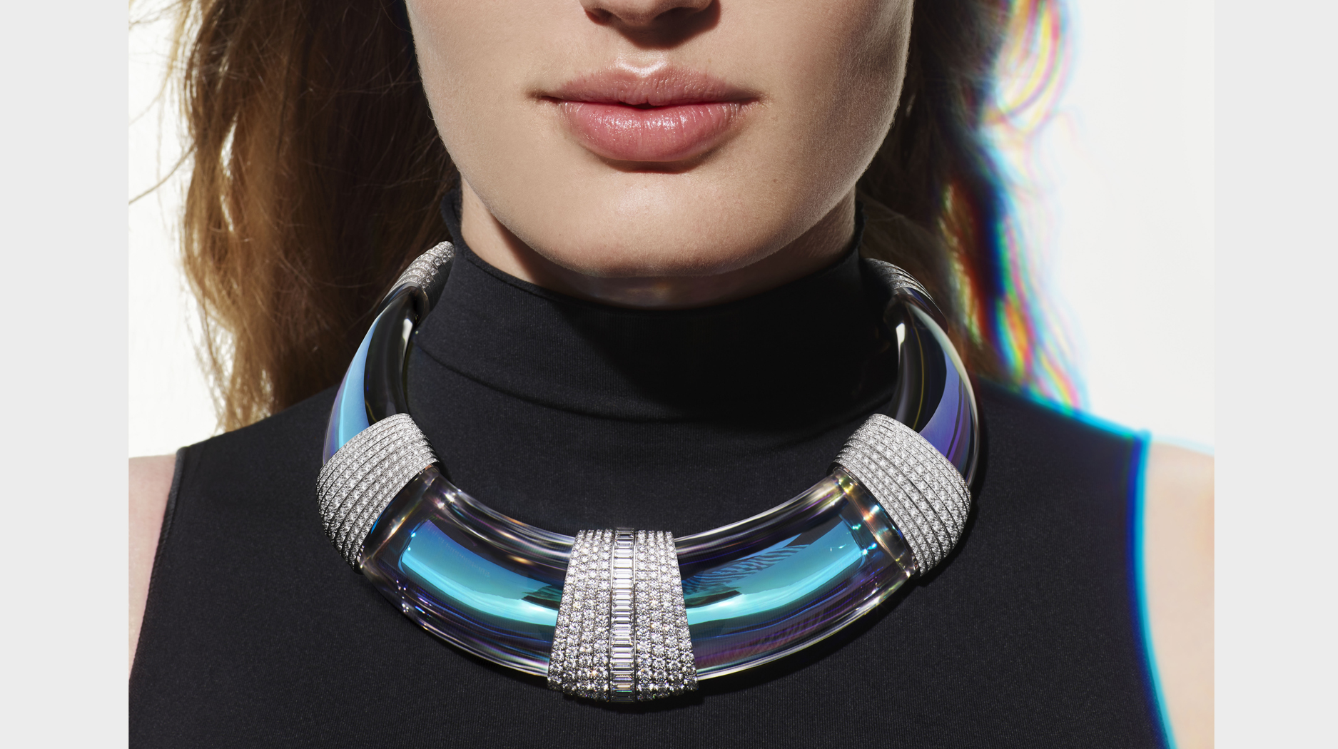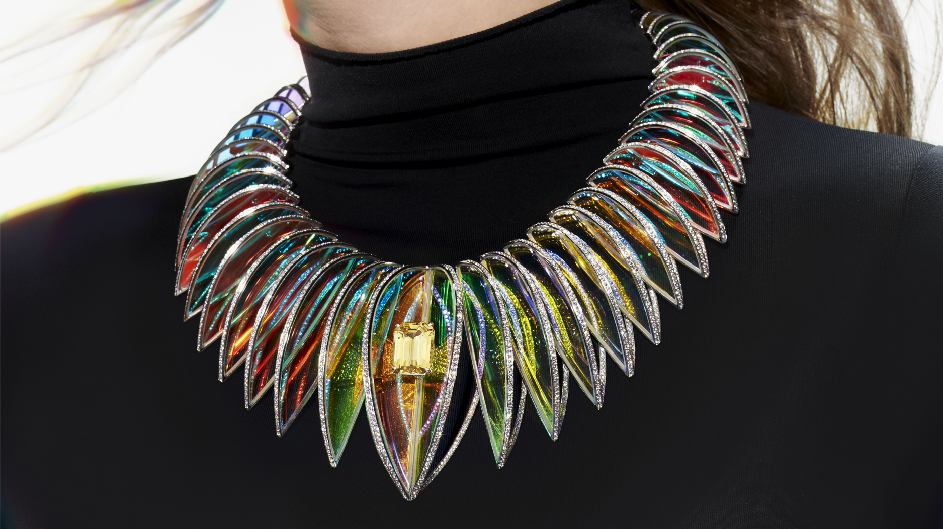 The “Holographique” collar with 20.21-carat octagonal yellow Ceylon sapphire, holographic rock crystal, diamond pavè, and white gold