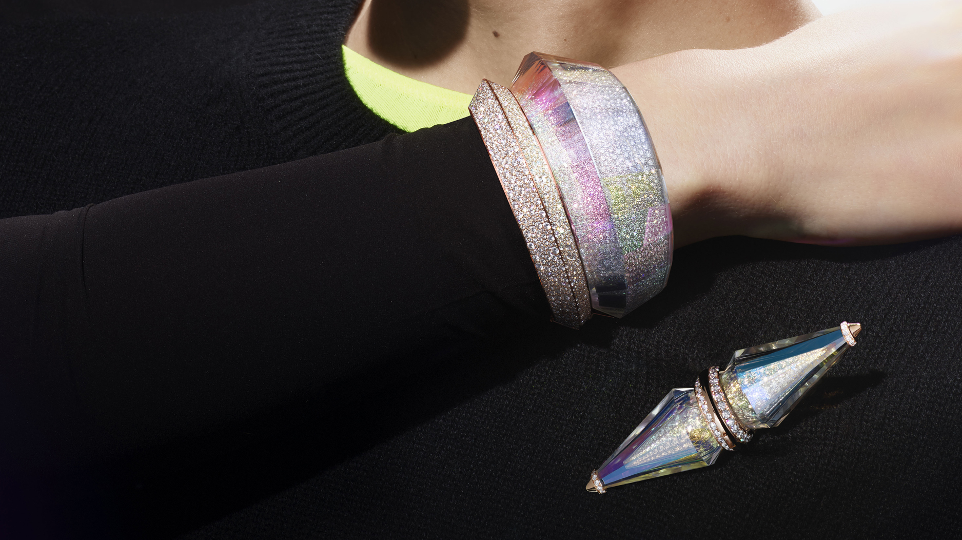 The “Faisceaux” brooch and bracelet set sees diamonds covered with a layer of rock crystal treated with the holographic coating, providing a dizzying array of light dimensions and sparkle.