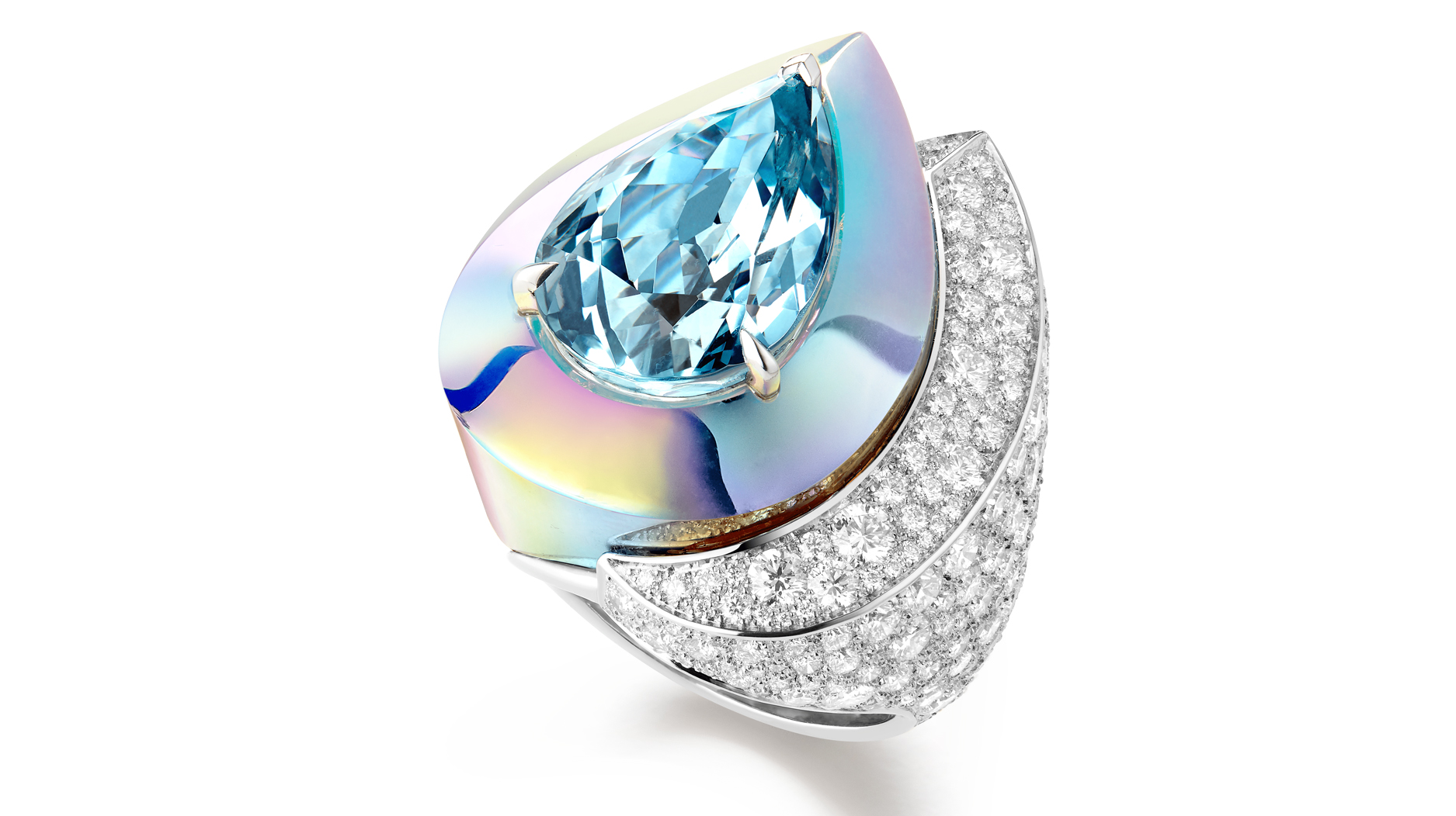“Laser” ring with 11.88-carat pear-cut aquamarine and holographic ceramic set in white gold with diamond pavè