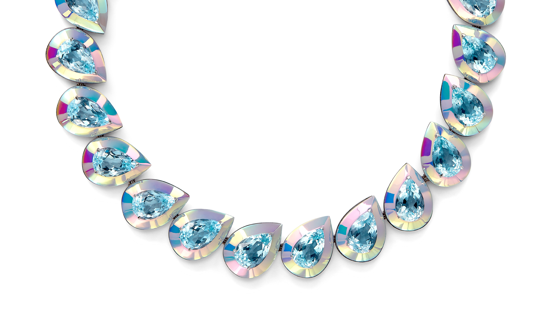 “Laser” necklace set with 23 pear-shaped aquamarines totaling 130.01 carats, with holographic ceramic set in white gold
