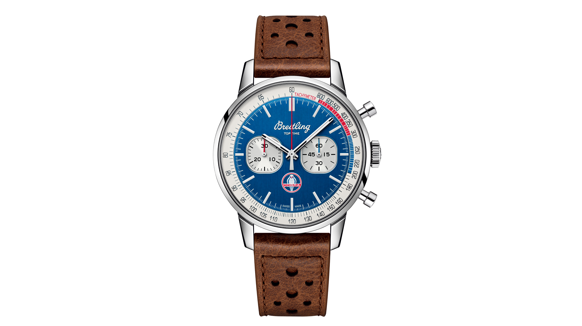 Finally, the Top Time Shelby Cobra has a blue dial with white tachymeter scale and contrasting subdials, plus a brown leather strap. Introduced in 1962, the Cobra combined a small, light chassis with American big-block engine.