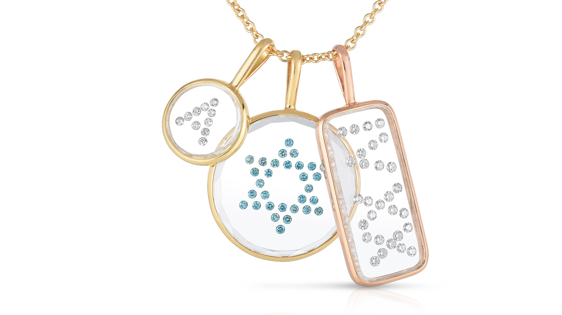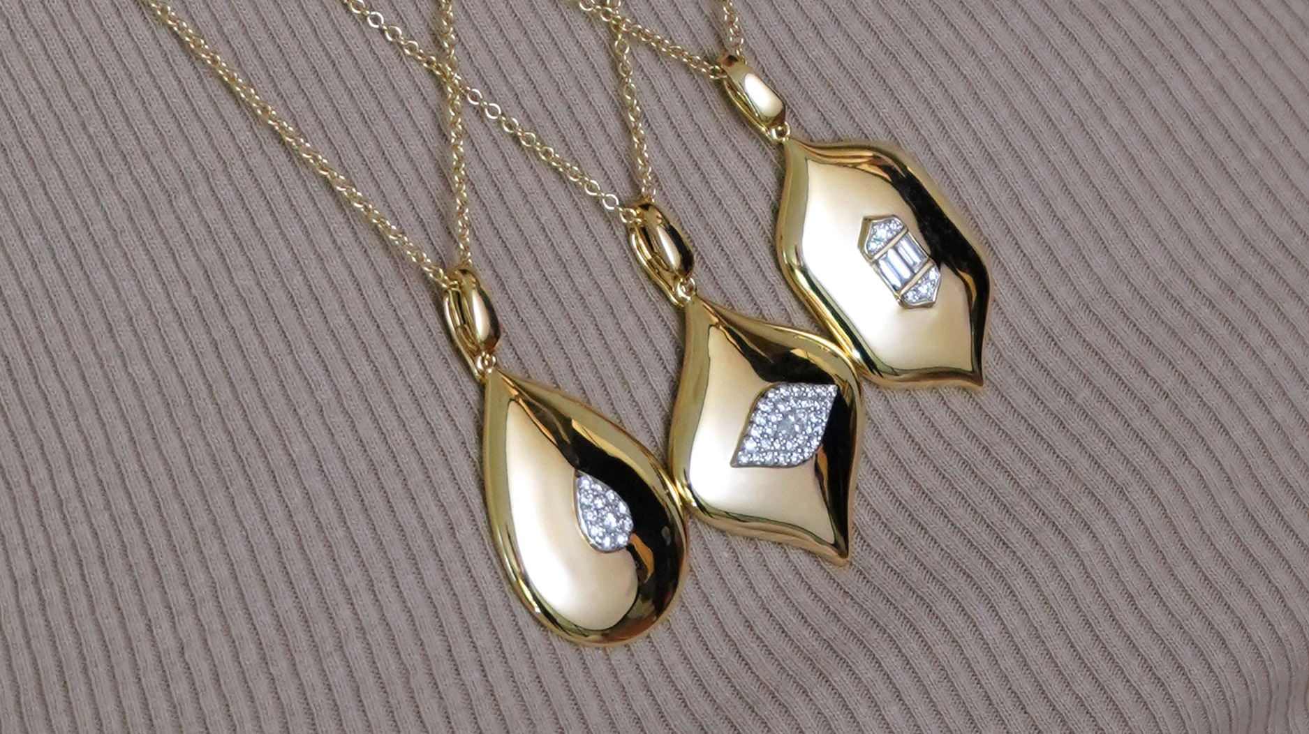 Sara Weinstock “Aurora Large Pear Shape” 18-karat yellow gold and diamond pendant with operable enhancer on 20-inch chain ($3,850); “Aurora Large Marquis Shape Pendant” in 18-karat yellow gold and diamonds with operable enhancer on 20-inch chain ($5,400); and “Aurora Large Taj Baguette” 18-karat yellow gold and diamond pendant with operable enhancer on a 20-inch chain ($5,675)