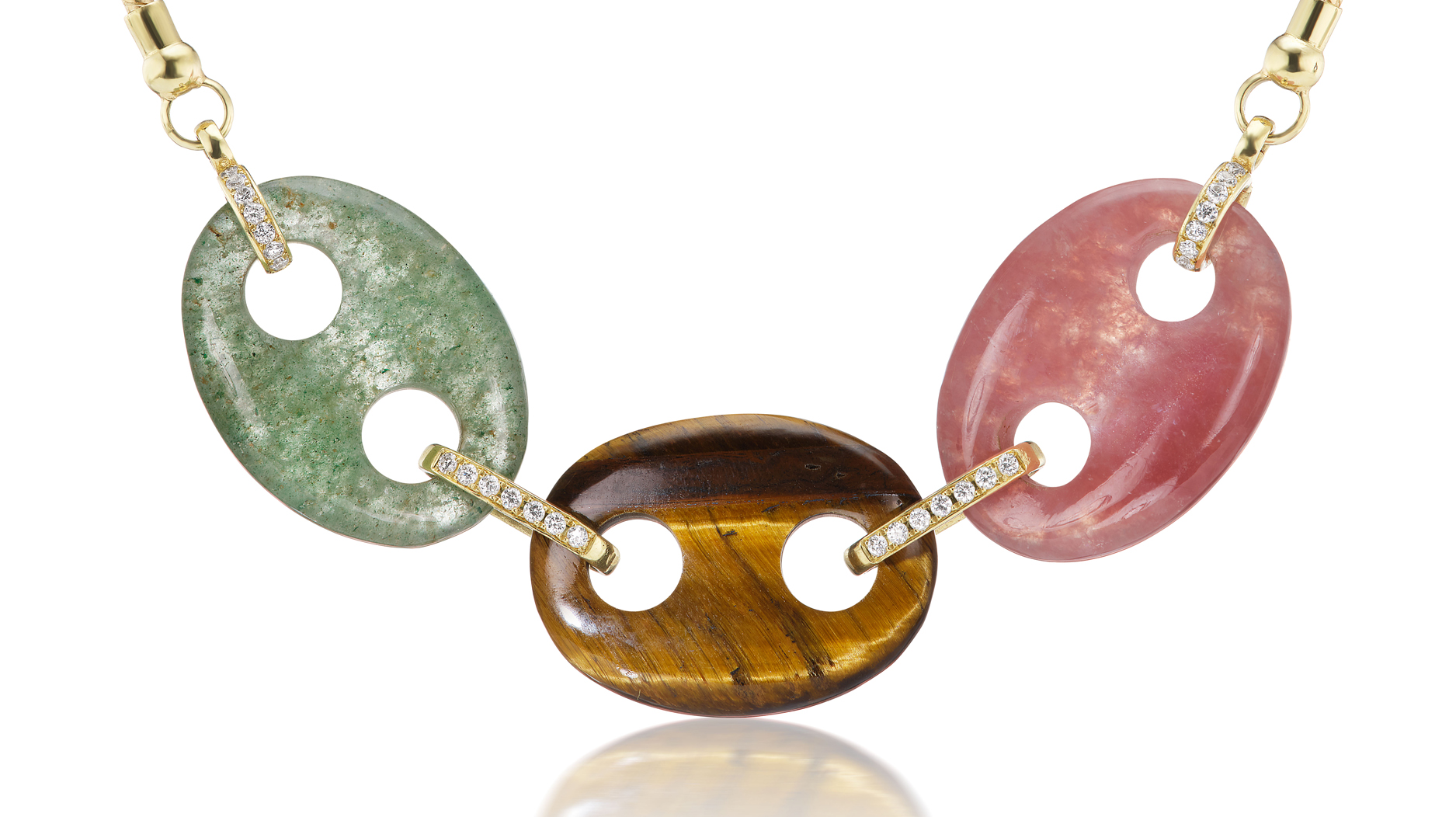 Jenna Blake green quartz, tiger’s eye, and rose quartz “Stone Mariner Link Charms” on 18-karat yellow gold and diamond necklace (price upon request)