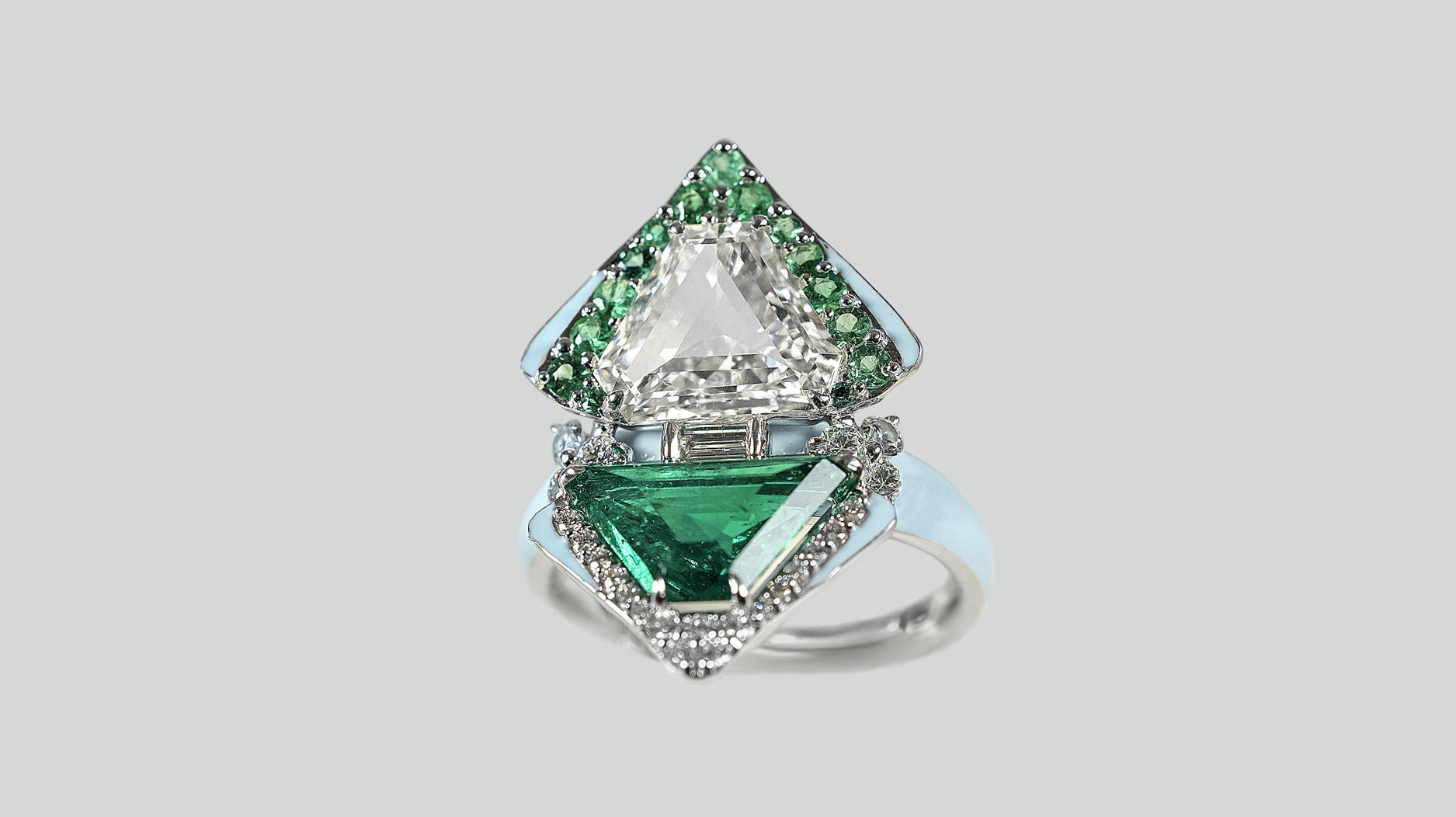Kamyen Jewellery 18-karat white gold ring with diamonds, emeralds and blue enamel (price upon request)