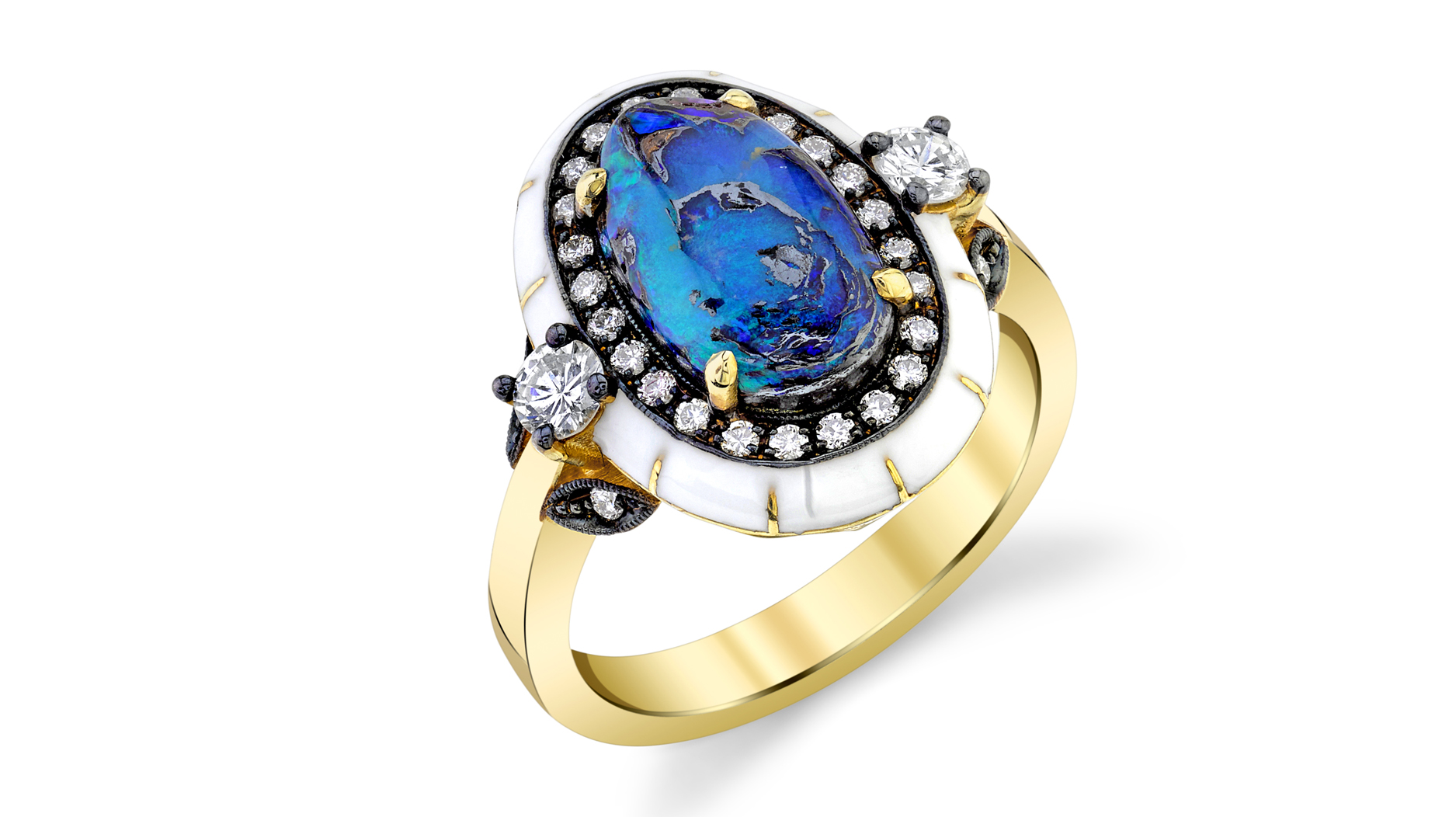 Lord Jewelry 18-karat yellow gold ring with 3.2-carat opal, 0.49 carats of diamonds, and enamel (price upon request)