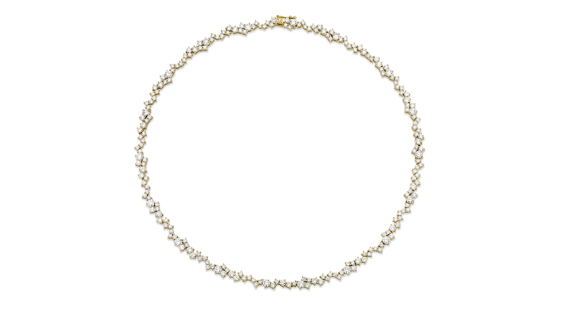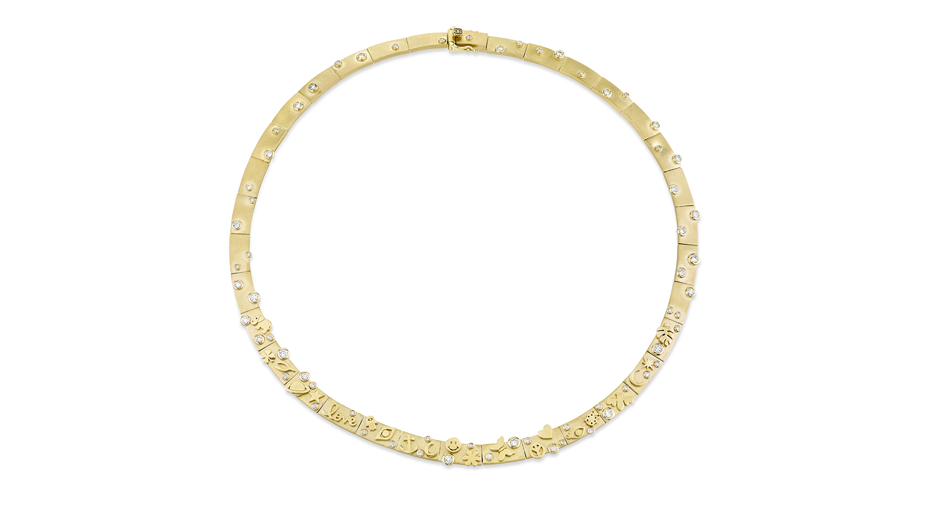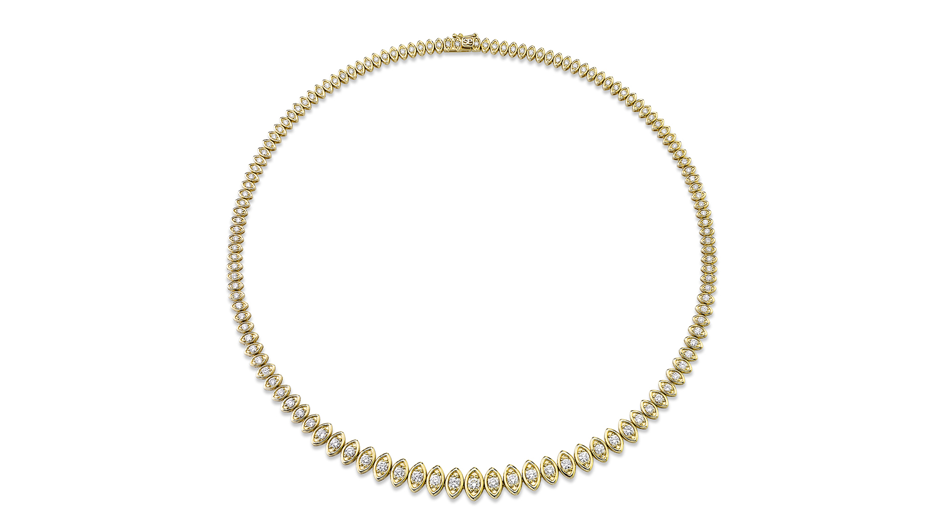 “I, of course, incorporated one of the most important elements in my collection, the eyes, which I have used since the beginning,” Karmes explained of a necklace with repeating marquise diamond eye motif.