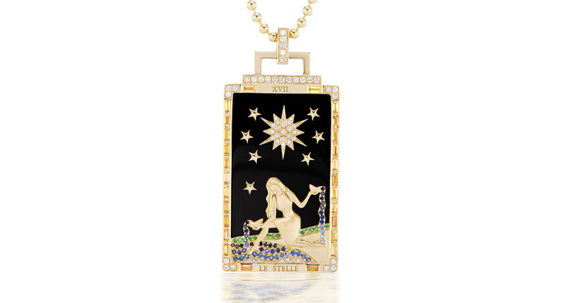 The collection’s hero pieces are pendants depicting five major tarot cards: Sun, Star, Moon, Strength and The Wheel (all retail for $17,500).