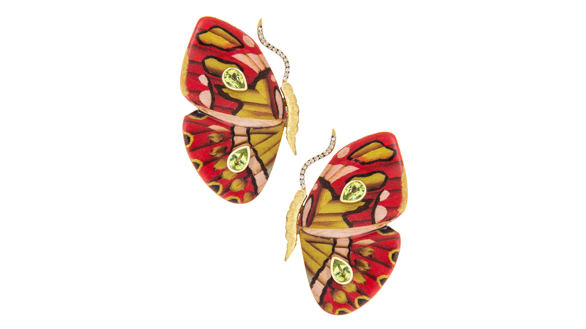 Silvia Furmanovich "Marquetry Butterfly Earrings" in 18-karat yellow gold with colored diamonds, peridot, tsavorite, and wood