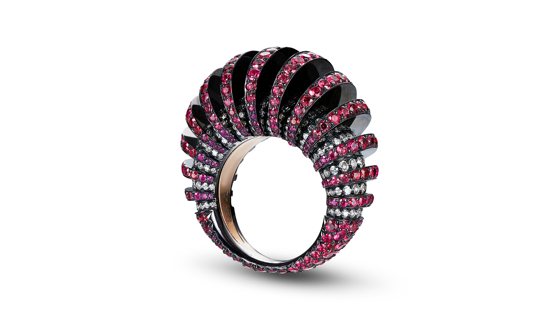 Lauren Adriana "Slice Ring" with diamonds and red spinels in 18-karat blackened and rose gold