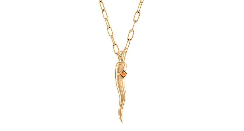Gina Ferranti of GiGi Ferranti Jewelry created her own version of the Italian horn, crafted in 18-karat yellow gold and set with a princess-cut orange sapphire.