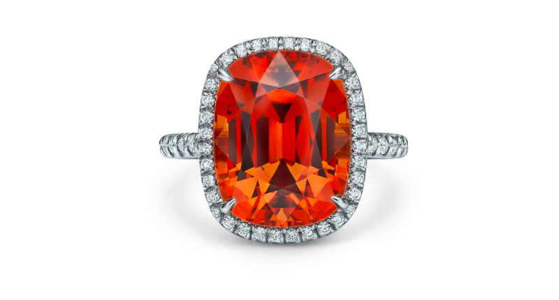 The pieces are nearly always classic and elegant, and this 11.25-carat cushion cut spessartine and diamond ring is no exception.