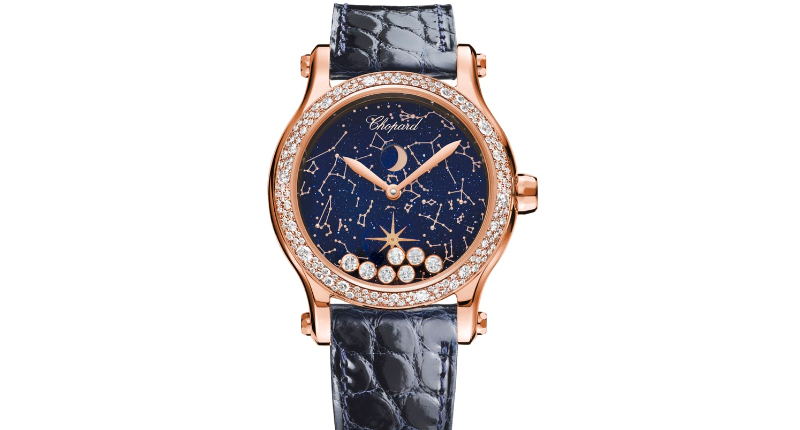 The Happy Moon watch by Chopard is a 36 mm 18-karat rose gold and diamond automatic timepiece with an aventurine dial and a blue alligator leather strap.