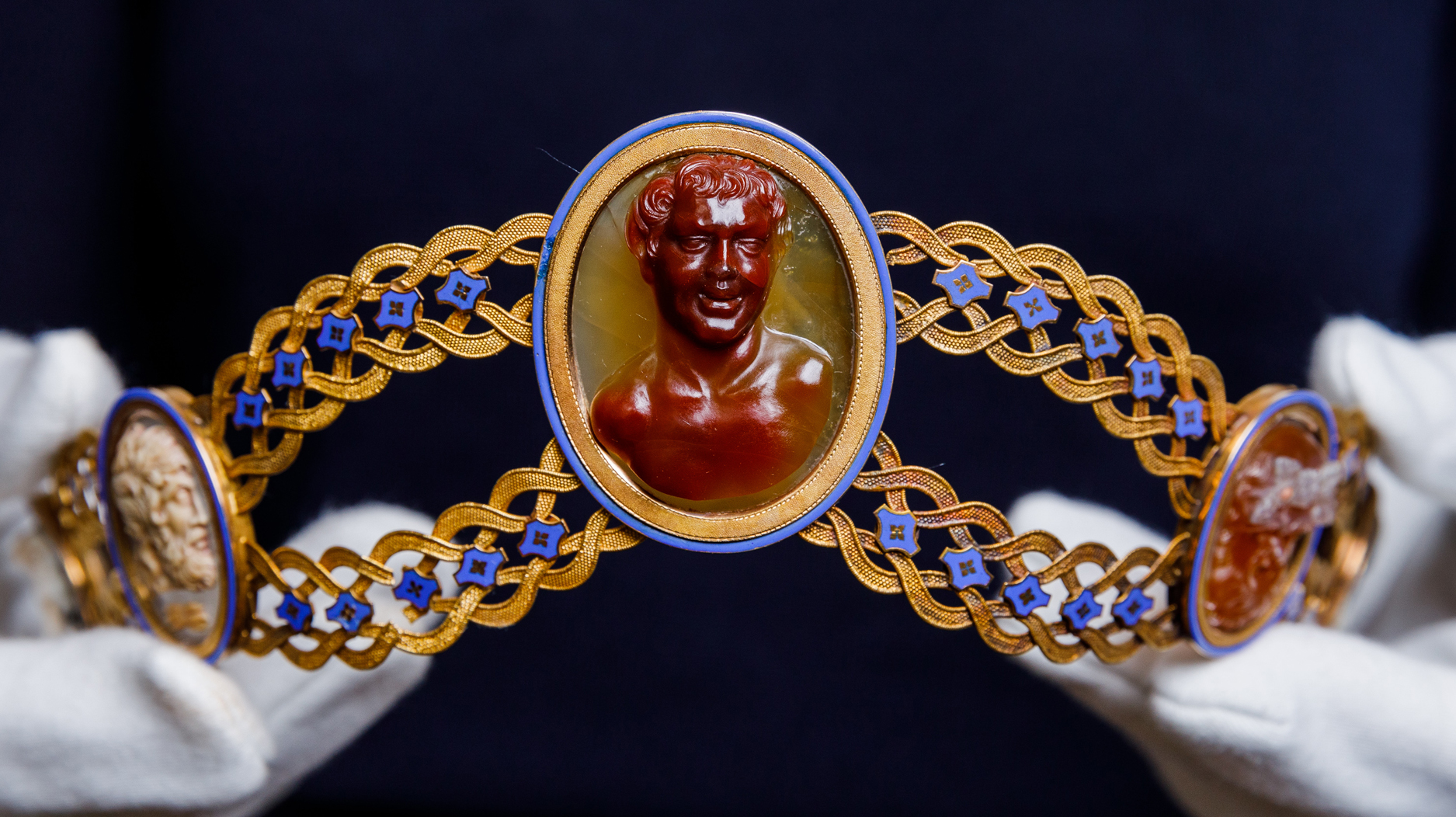 One tiara (pictured at top of article) is made of gold with blue champleve enamel, with 25 carnelian intaglios depicting male and female classical heads.
