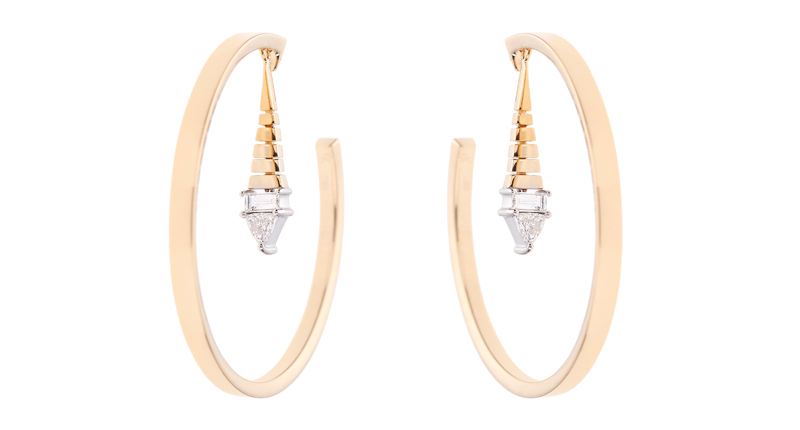 Winfrey came up with an alternative, and far superior, gift—the below pair of 18-karat gold Nikos Koulis hoop earrings with a dangling gold and diamond drop. She also gave Gorman a ring from costume jewelry brand Of Rare Origin.