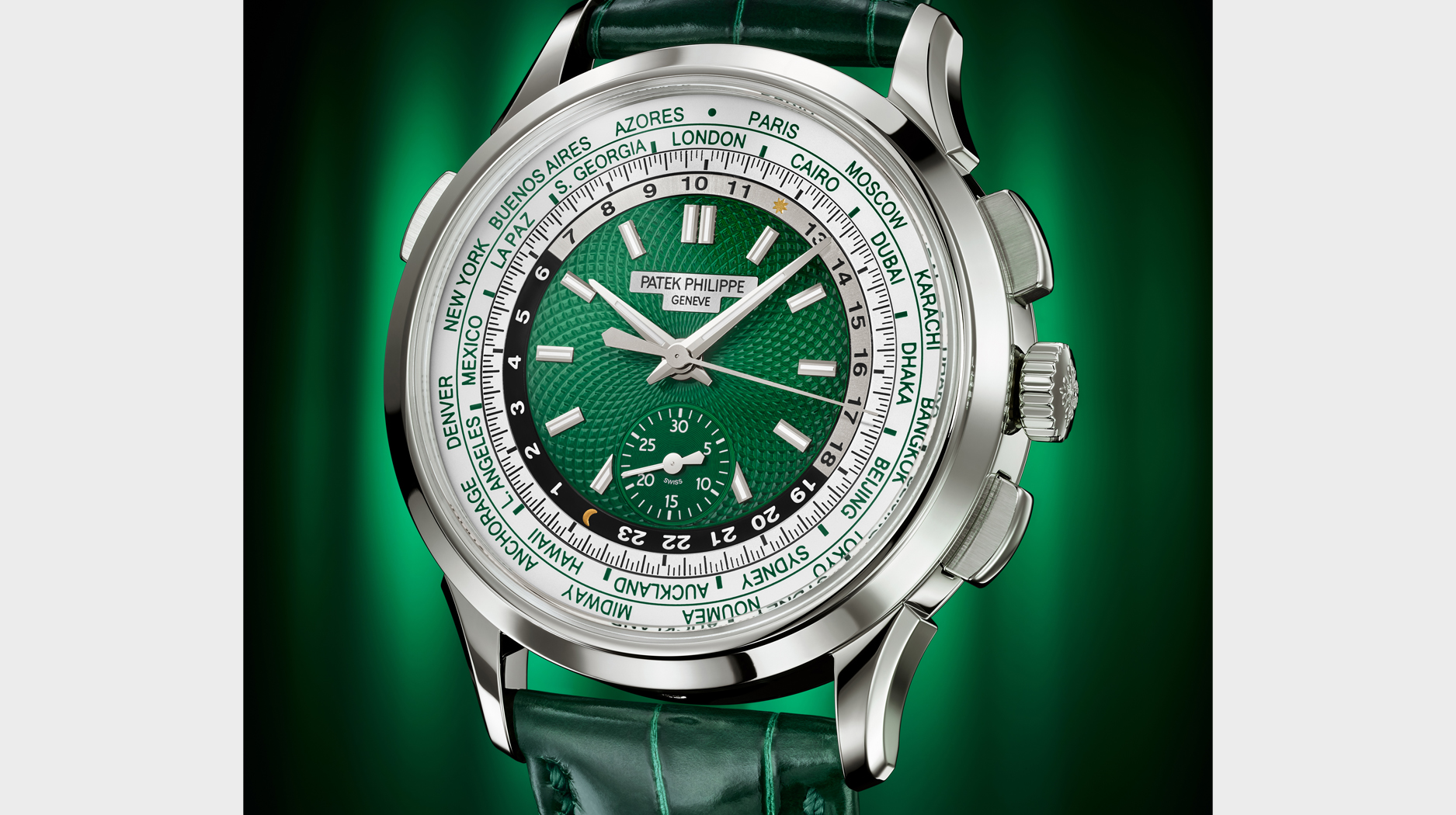 The new version is rendered in platinum with a green, hand-guilloche circular pattern dial and green alligator strap with platinum fold-over clasp.