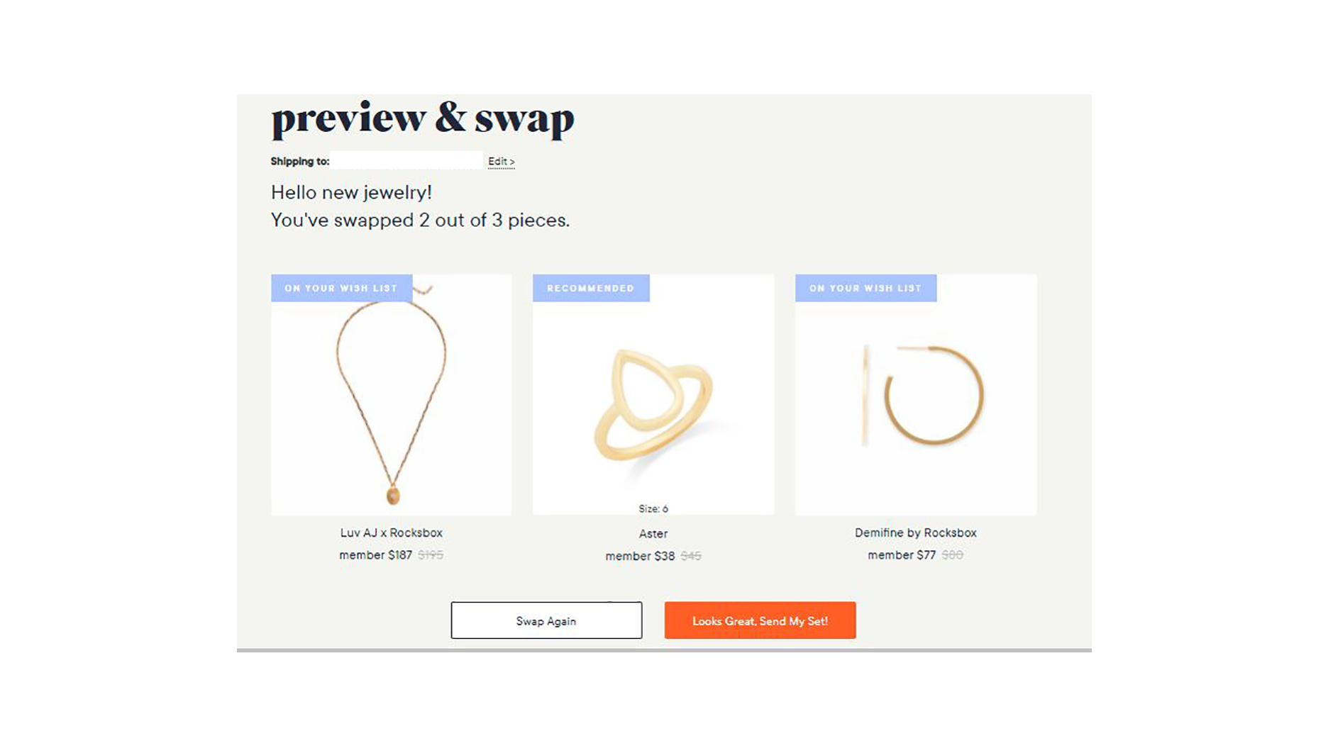 The only downside is that Rocksbox uses USPS, which I find to be the least user-friendly and slowest of all the shipping options.
