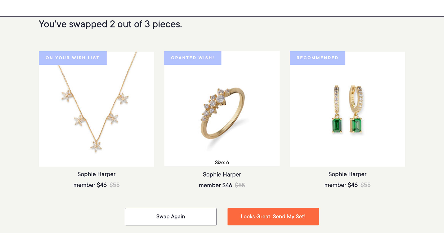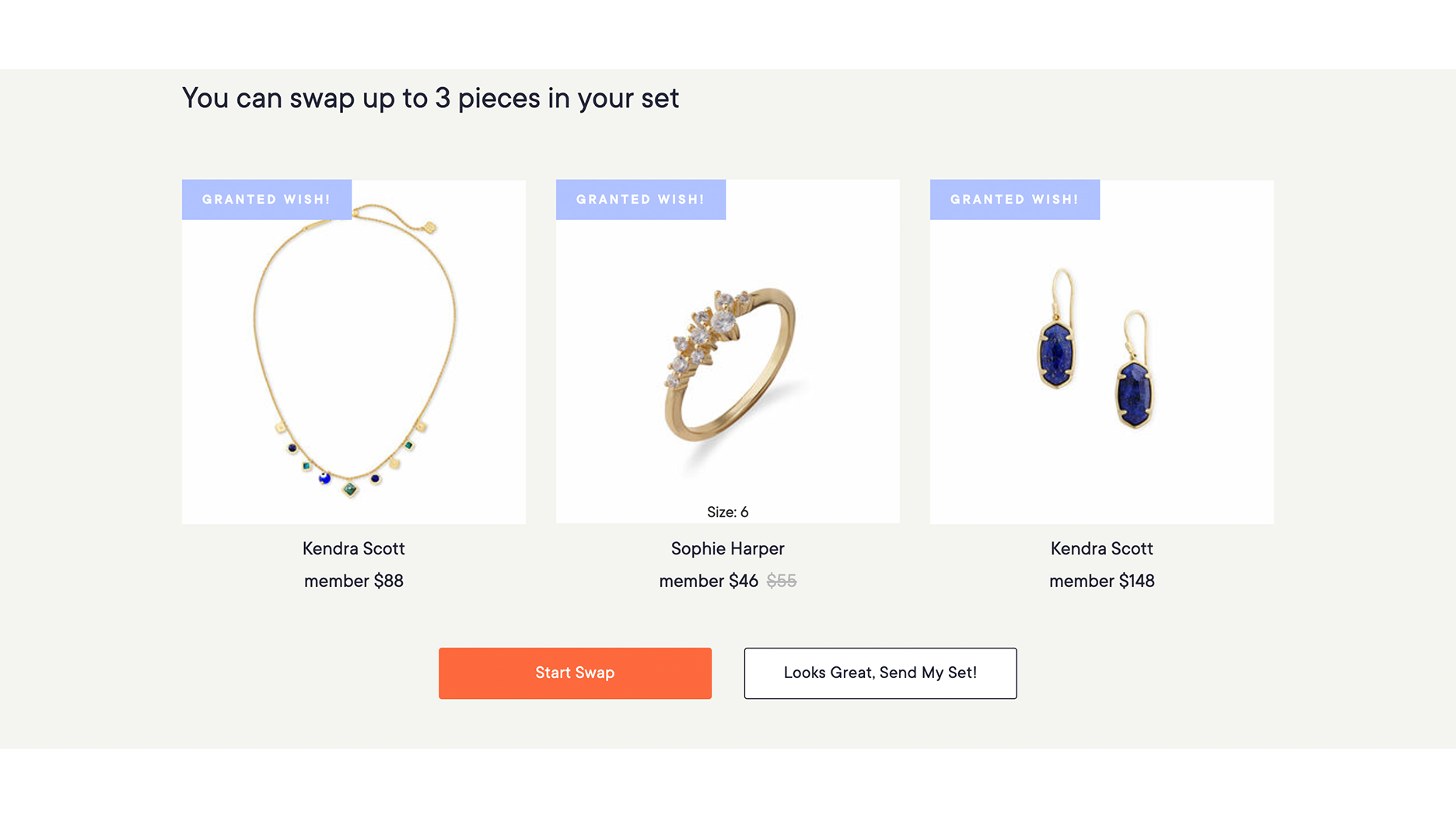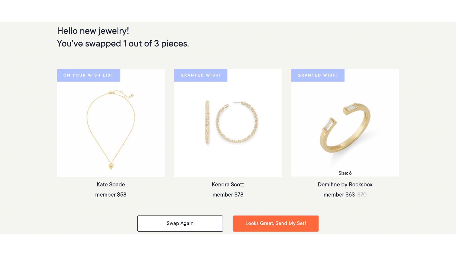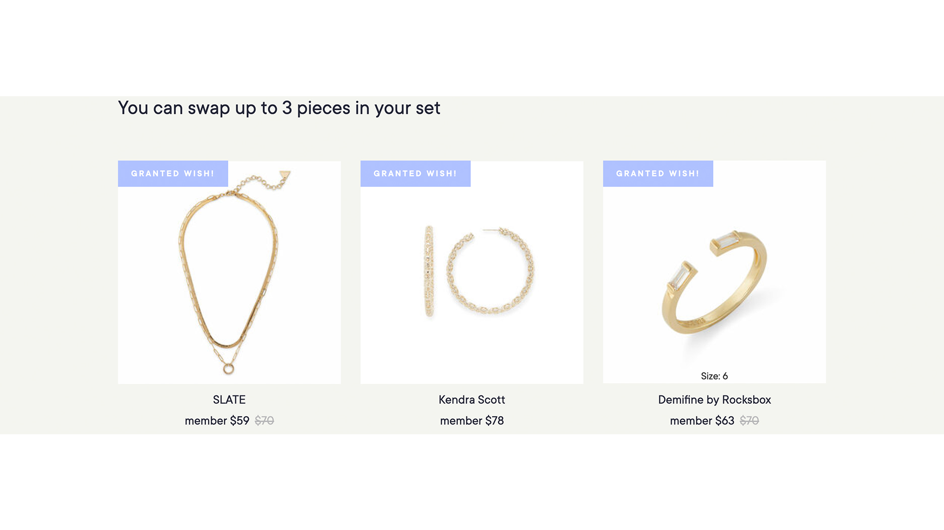 Based on my answers, Rocksbox selected the three pieces pictured below for me.