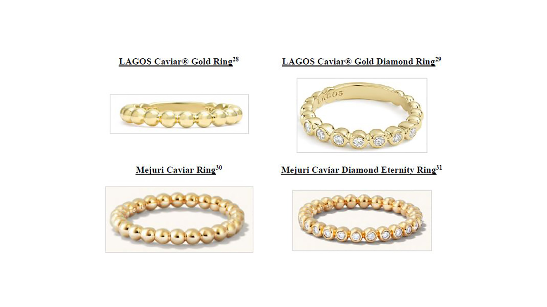 It states Mejuri’s “Charlotte” ring and earrings appear to be copies of Boucheron's “Quatre” ring and earrings, and Mejuri's “Caviar” ring looks to be a copy of Lagos's “Caviar” ring.