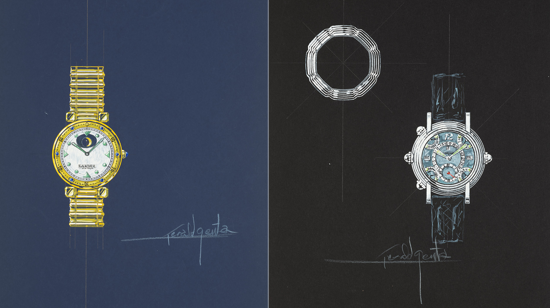Each started with a single circle drawn with Genta’s compass to the exact size of the watch and then produced with fine pencils and paintbrushes, allowing for the final watches to be identical to his original to-scale designs.