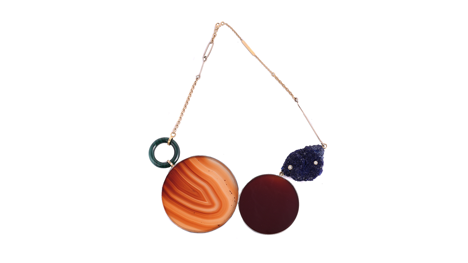 The necklace features an azurite crystal set with a pair of brilliant-cut diamonds in a bezel setting with circular panels of cornelian and banded agate.
