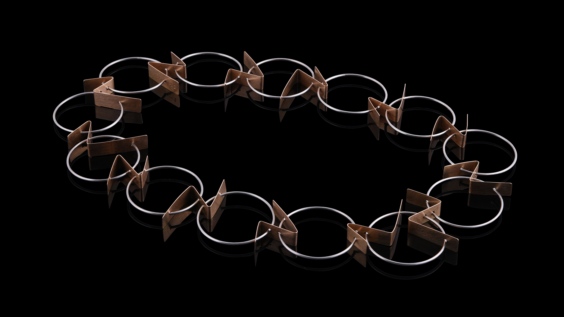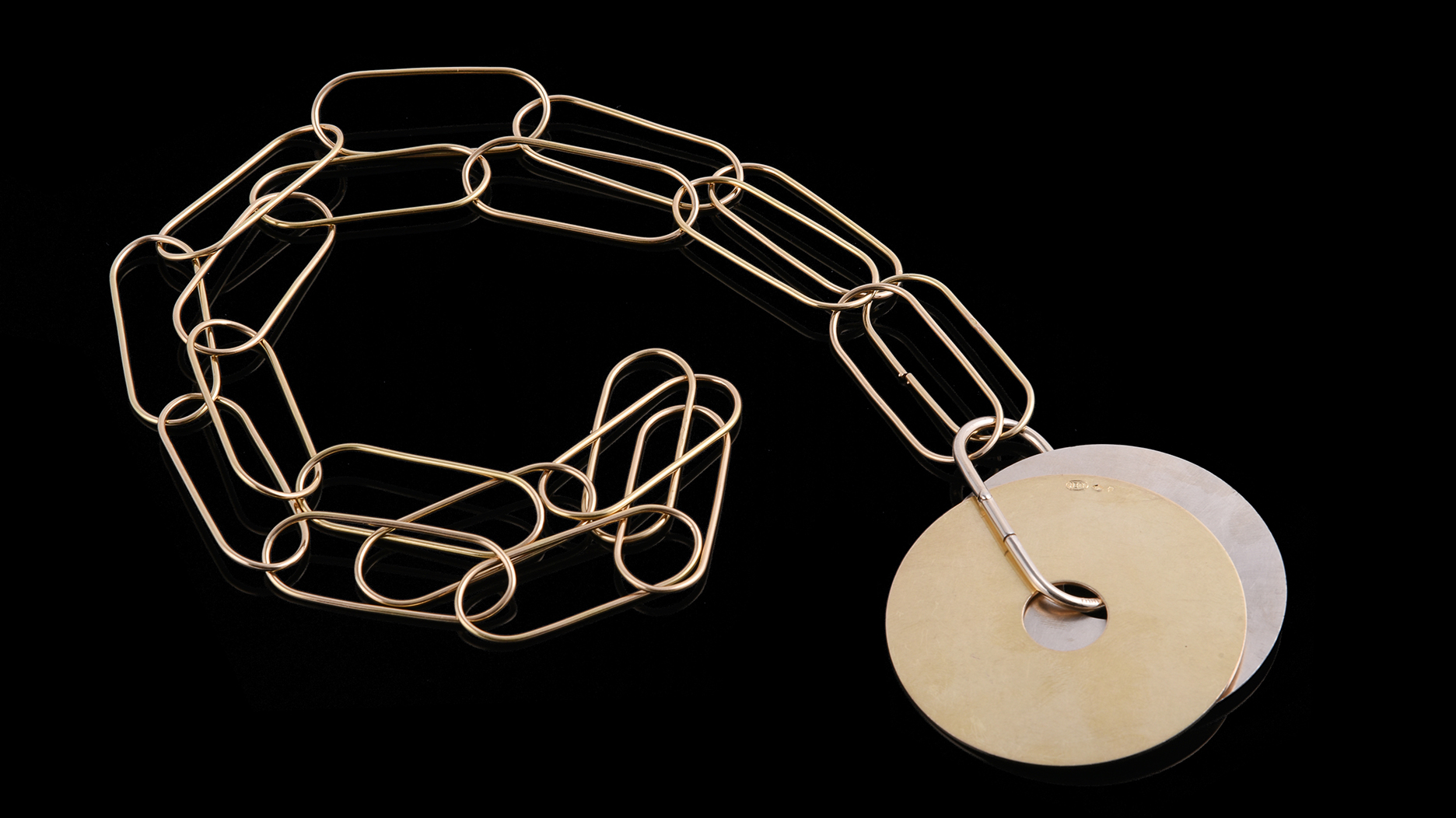 Titled “Haken,” the necklace features circular links with lightning bolt-shaped gold-colored connectors.