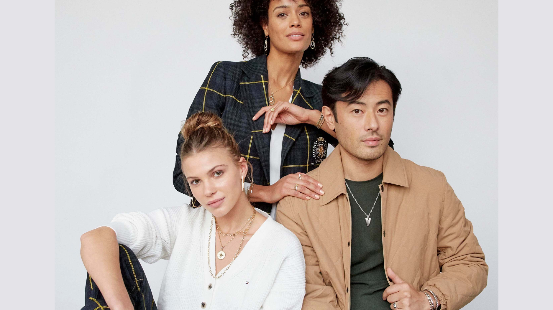 The Gabriel & Co. and Tommy Hilfiger shoot featured many such pieces, with models mixing different chain weights and lengths for a layered look that was often unisex. Female models sported lots of hoop earrings throughout, as well as more traditionally feminine pearl stud earrings with diamond accents, while the male model sported stacks of bracelets, chunky rings, and a single pendant in many of the looks.