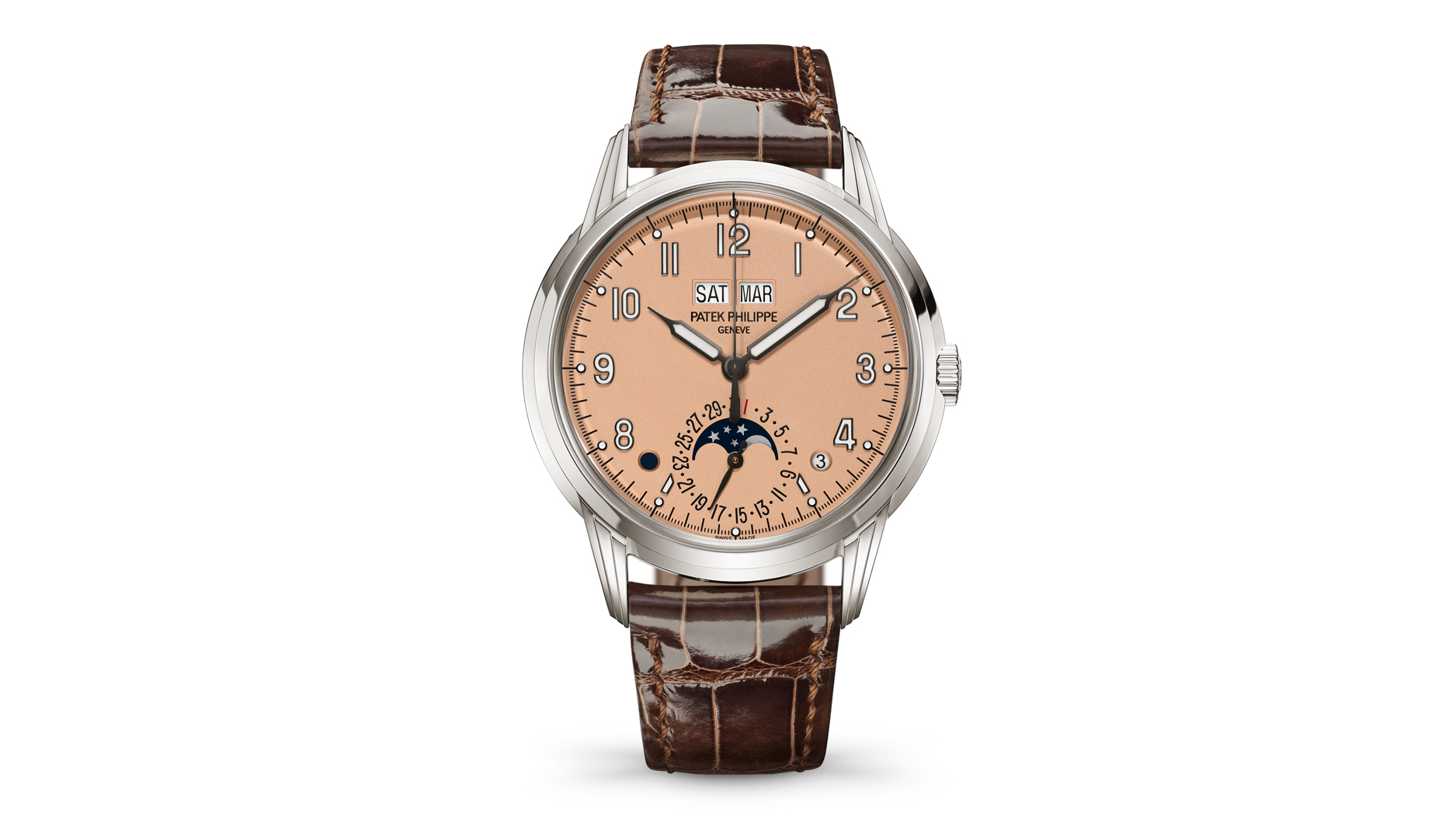 The 5320G is a new take on the Patek Philippe Perpetual Calendar crafted in white gold with a “rose-gilt” opaline dial.