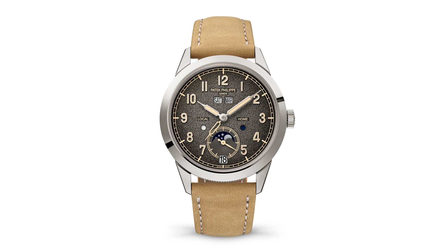 The Ref. 5326G-001 Annual Calendar Travel Time comes with two leather straps—beige and black.