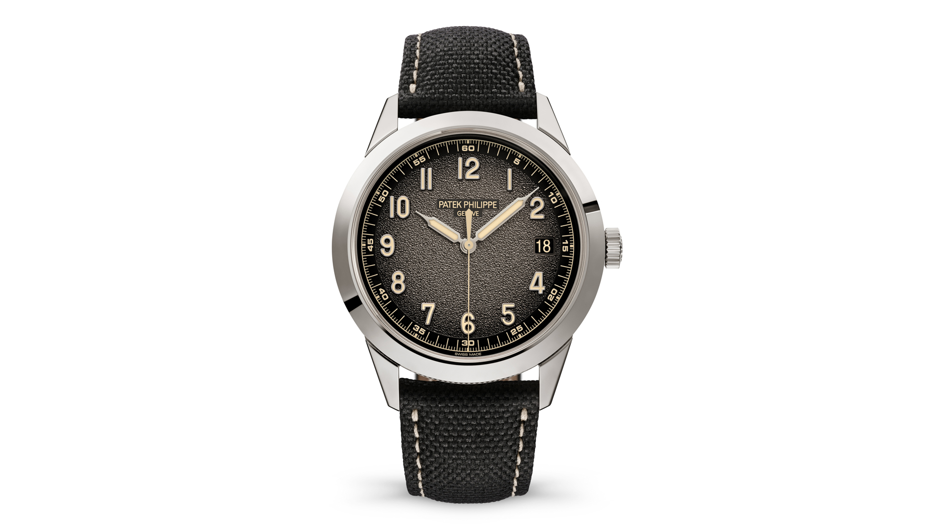 The Annual Calendar Travel Time utilizes the Calatrava case in white gold with a textured charcoal gray dial with black-gradient rim. The 41 mm timepiece comes with two calfskin straps in beige and black.