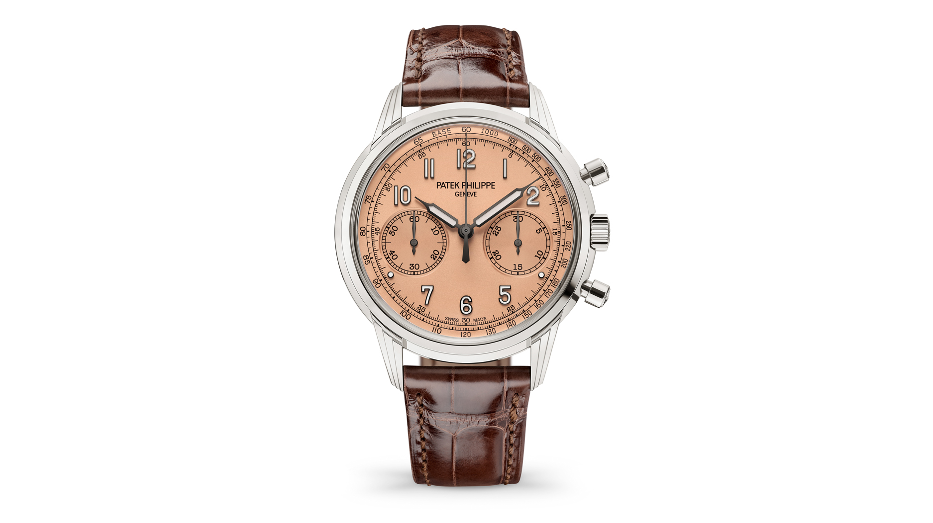 The 5172G chronograph has a white gold case and “rose-gilt” opaline dial, plus charcoal gray hour and minute hands.
