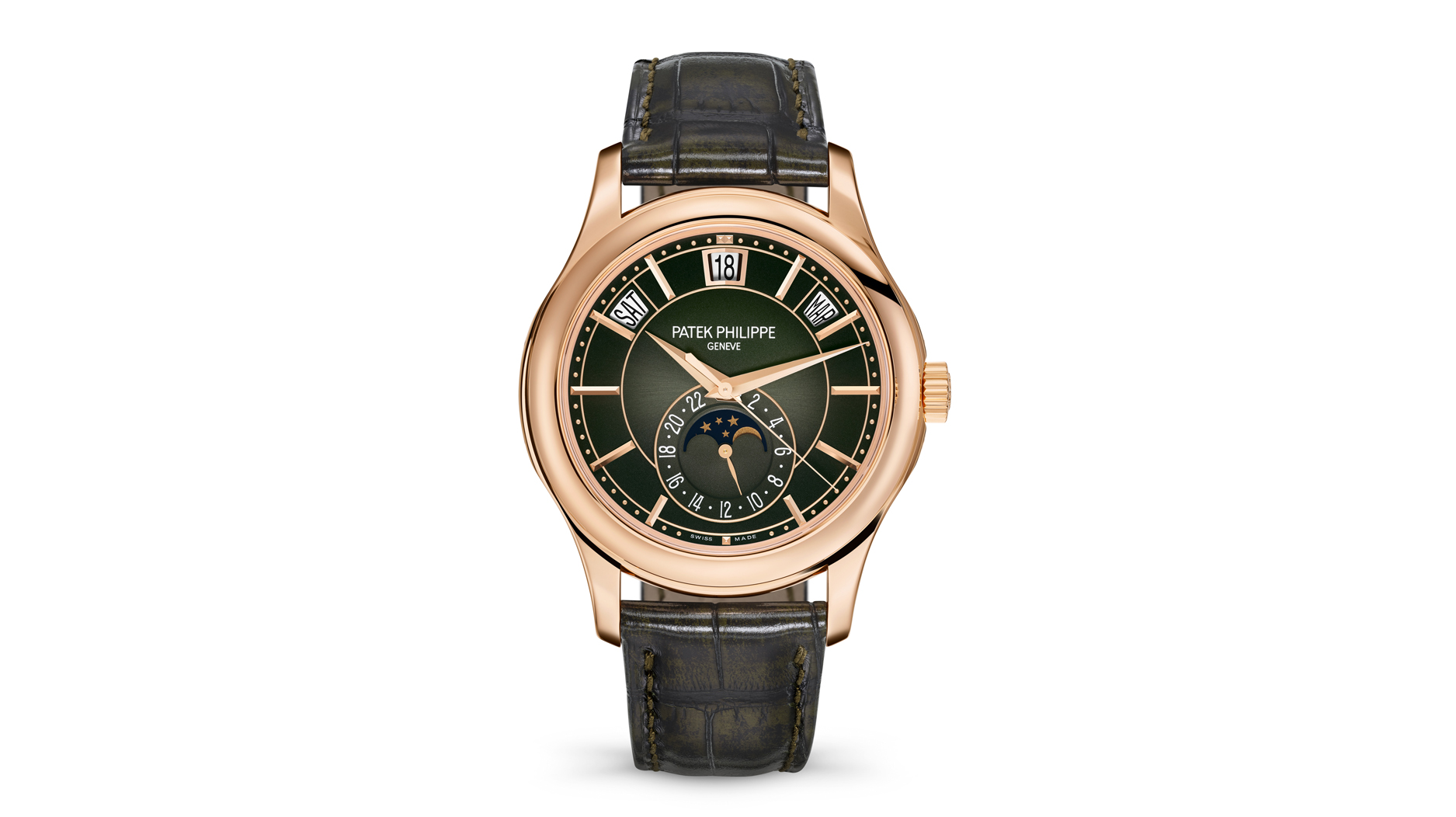 The 5205R is also crafted in rose gold, but with an olive-green sunburst dial with black-gradient rim. The polished case has recessed flanks, skeletonized lugs, and concave bezel.