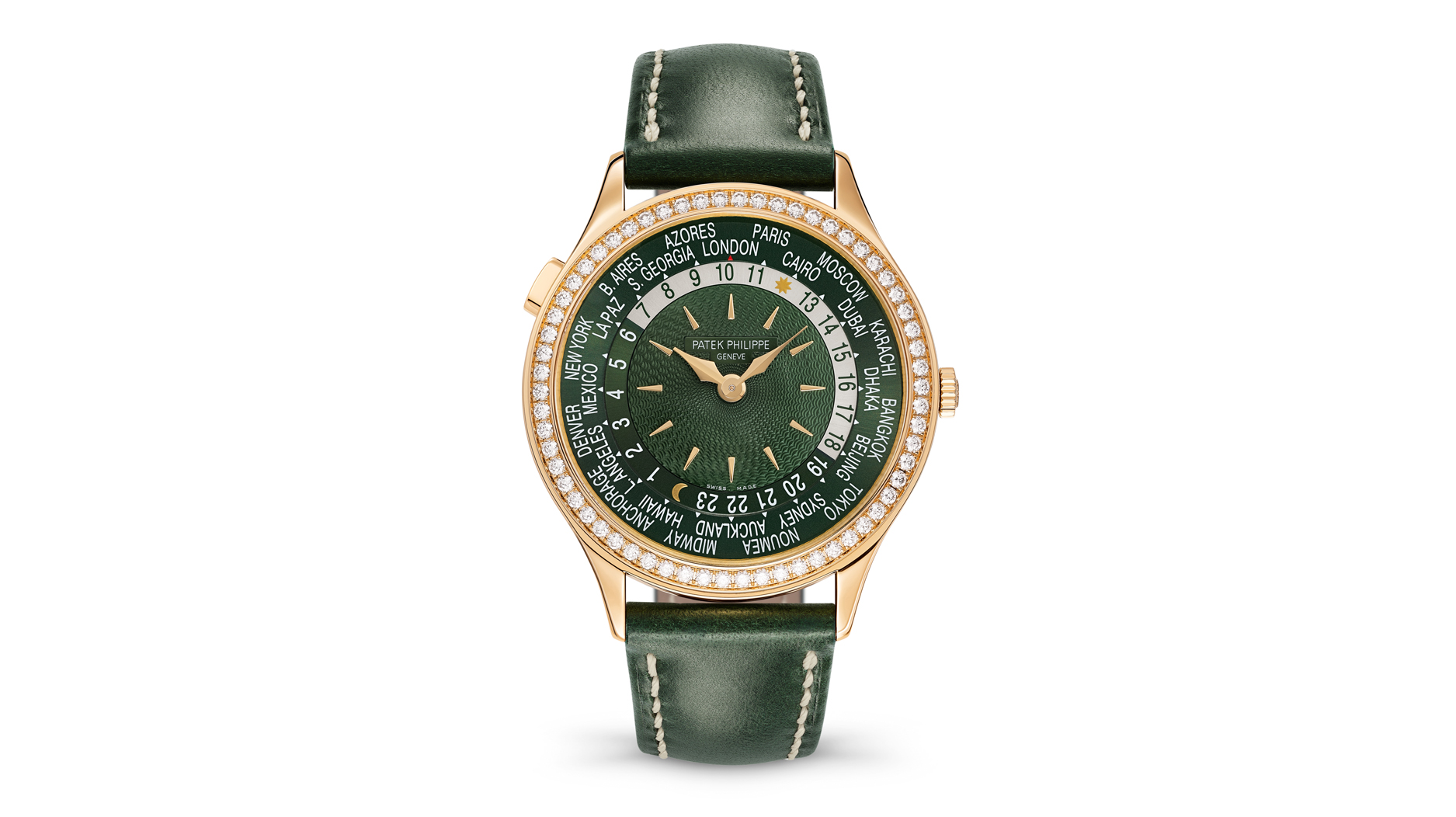 This edition has an olive-green dial with a hand-guilloched center in an old-basket weave motif. The city names are depicted in white on an olive-green disk.