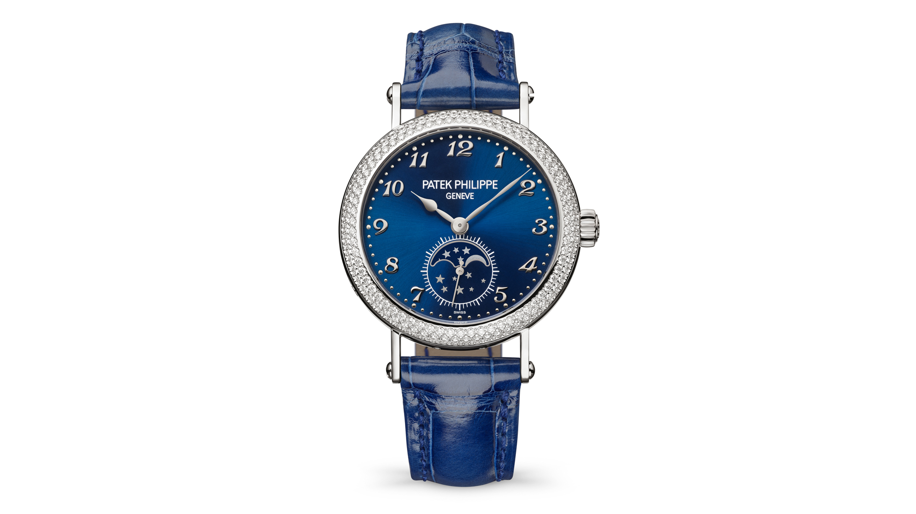 There are diamond minute markets and baguette-cut blue sapphire hour marks. Patek Philippe says the elaborate stone-setting creates an “amphitheater” effect, with the dial at the center.