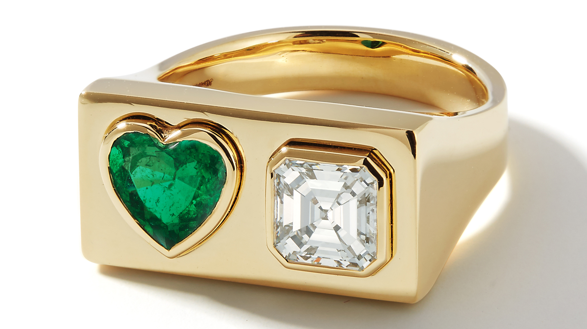 It features a 1.03-carat heart-shaped Colombian emerald—a nod to Jemma Wynne’s classically feminine aesthetic—paired with a 1.11-carat Asscher-cut diamond set in 18-karat yellow gold.
