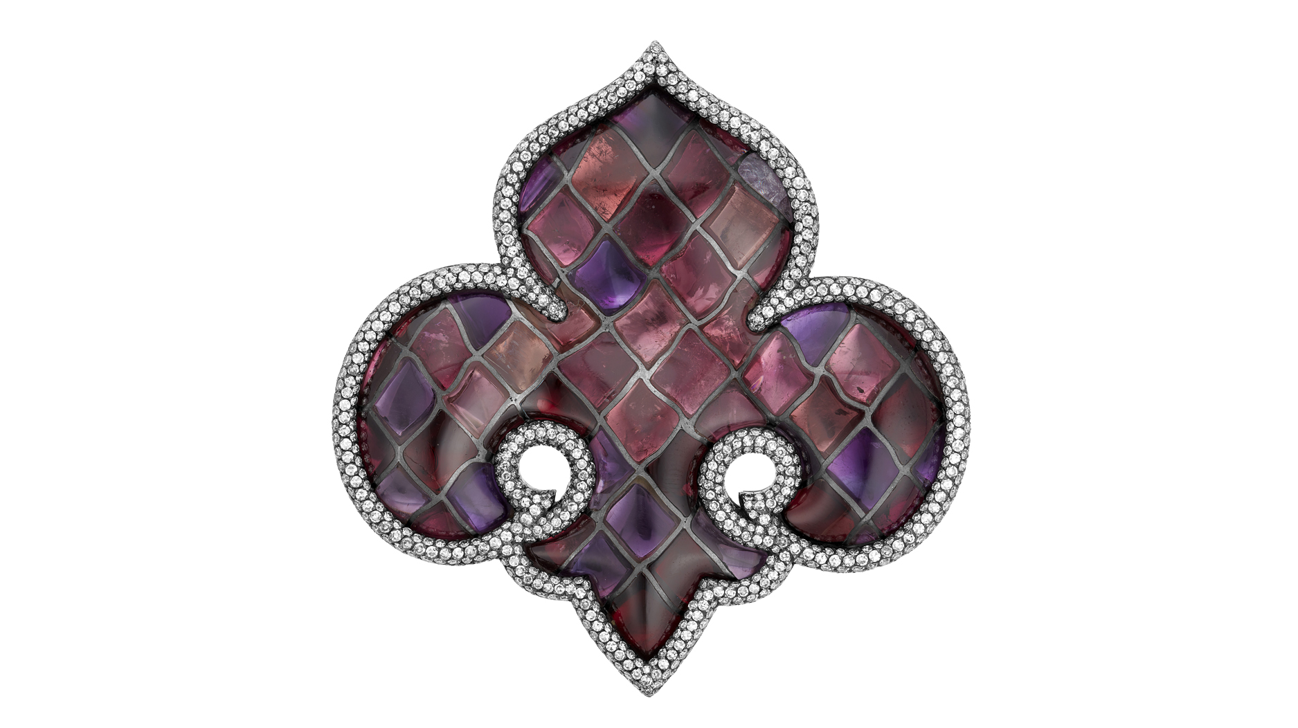 The “Vitrail Fleur-de-Lys” brooch features amethysts, tourmalines, garnets, and round diamonds in 18-karat gold and silver. Created in 1987, it is expected to earn between $80,000 and $120,000. (Image courtesy of Christie’s Images Ltd. 2022)