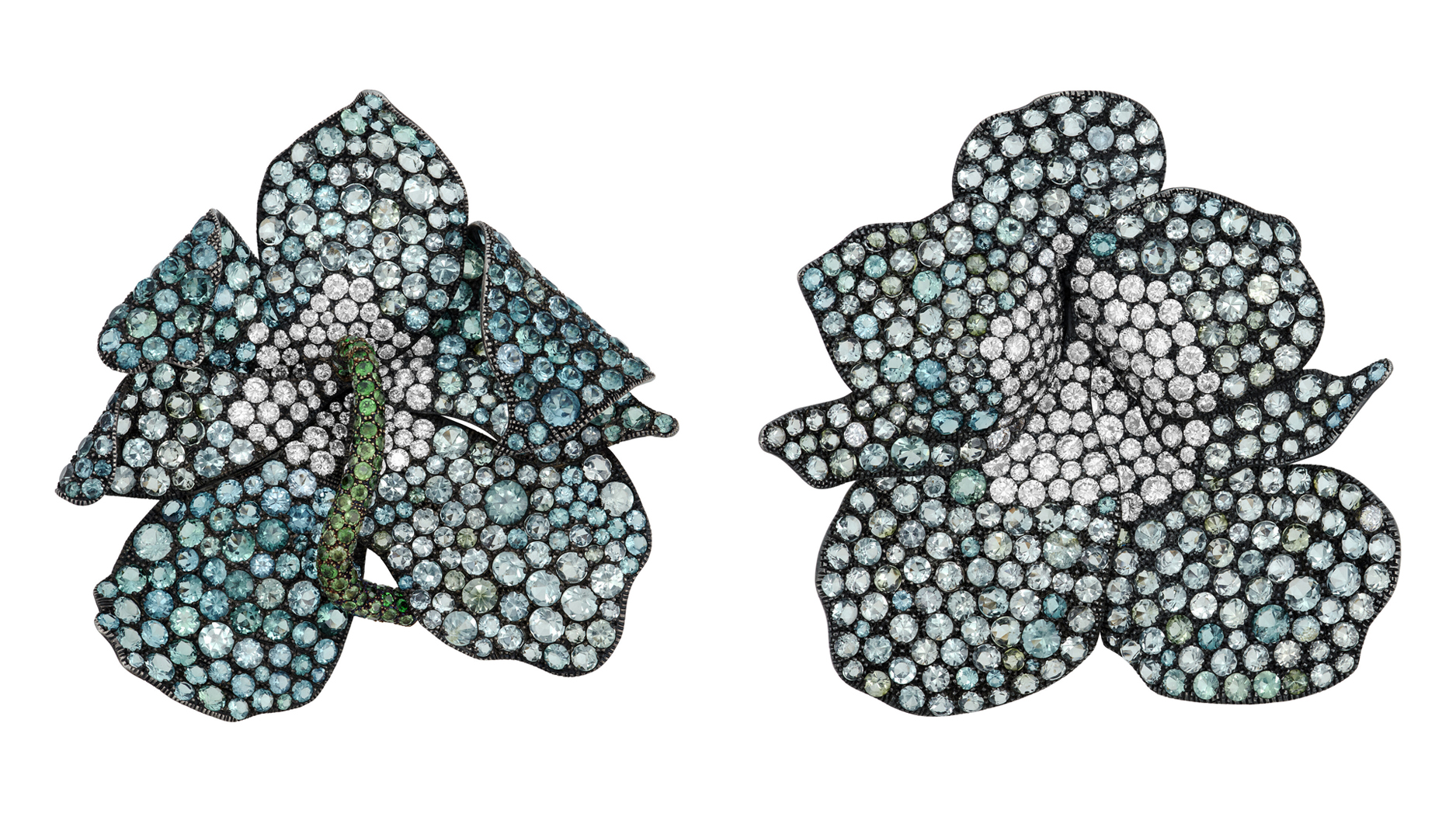This pair of JAR sapphire, diamond, tourmaline, and green garnet “Green Orchid” brooches from 1989 are estimated to sell for $100,00-$150,000. (Image courtesy of Christie’s Images Ltd. 2022)