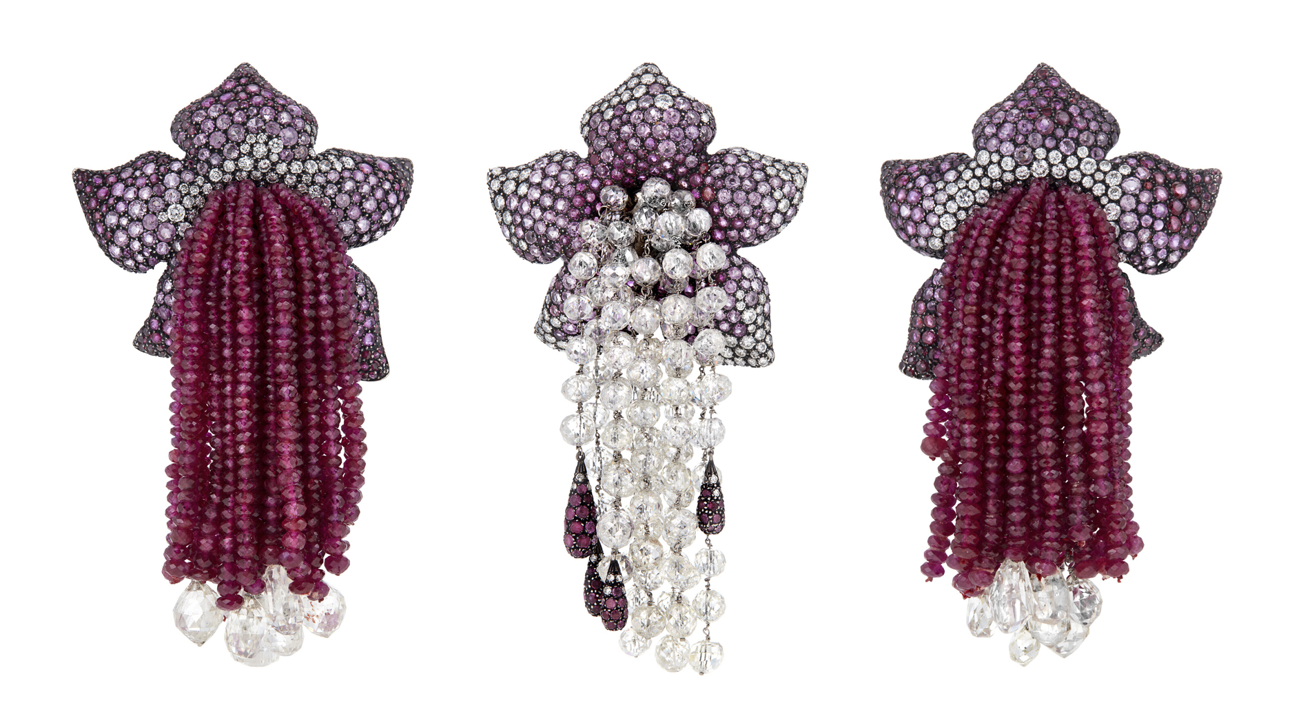 Featuring diamonds, rubies, and sapphires, these three “Fleur Pompons” brooches from 1989 are estimated to earn between $200,000 and $300,000. Each is signed JAR, Paris. (Image courtesy of Christie’s Images Ltd. 2022)
