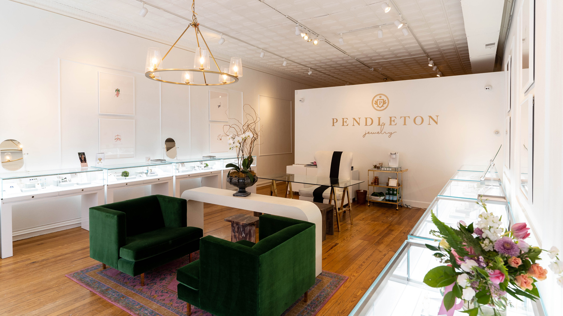 Pendleton Jewelry’s aim is to be “fun and unexpected,” less fussy and intimidating than a traditional jewelry store. The layout is designed for comfort and interaction. There are seating areas for relaxing or planning a custom piece, while jewelry cases are set against the wall, without a counter separating staff and customers.
