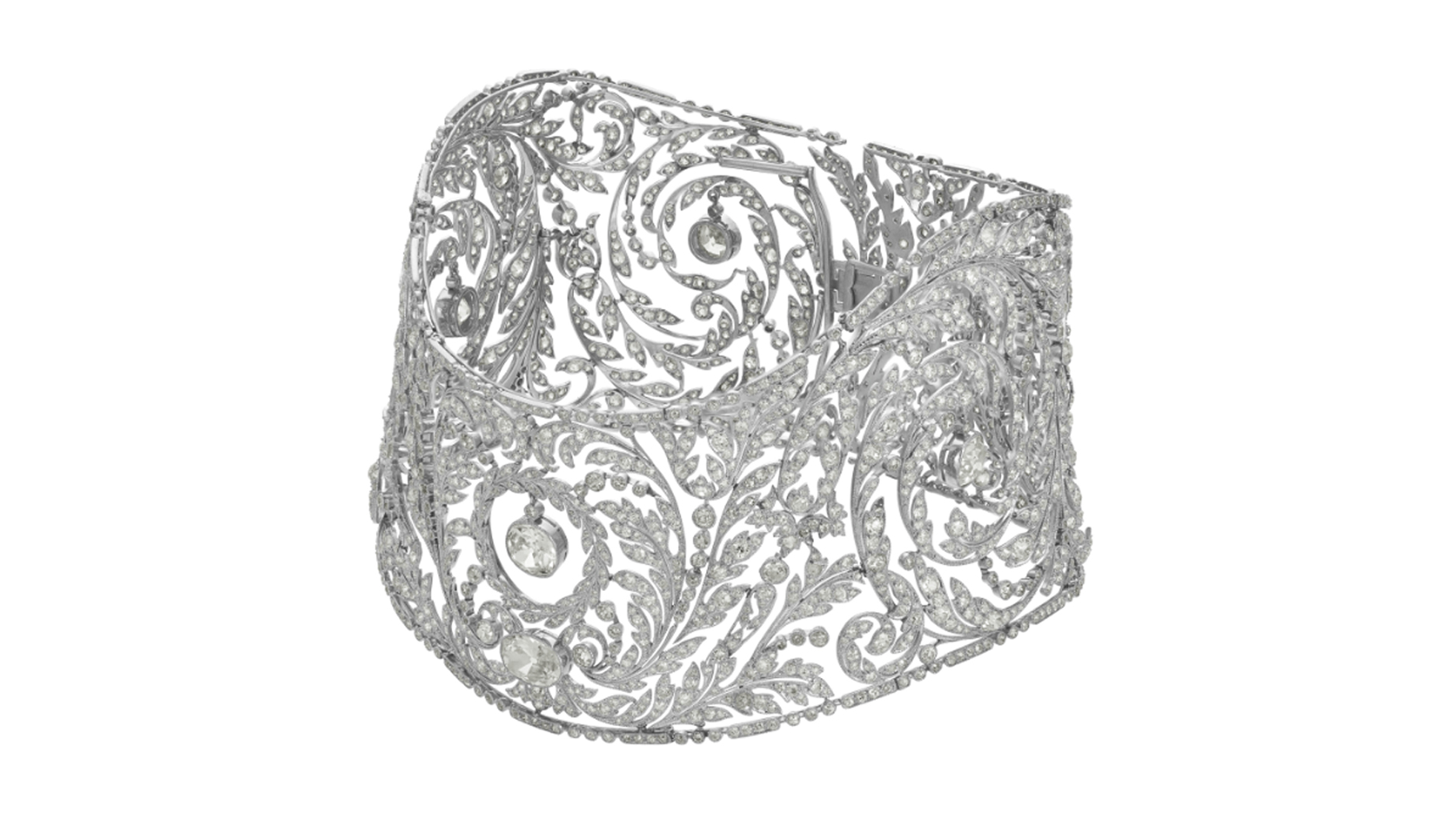 There was also a circa 1955 Harry Winston necklace made with round, baguette, and pear-shaped diamonds in platinum that nearly doubled its pre-sale high estimate when it garnered $970,200, and the circa 1910 Belle Epoque diamond choker necklace pictured above that obliterated its $60,000-$80,000 pre-sale estimate with a final price of $409,500.