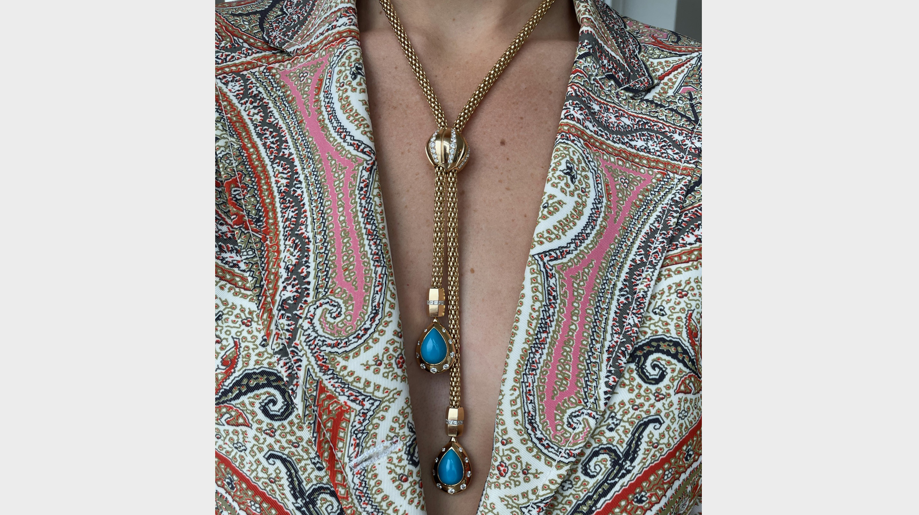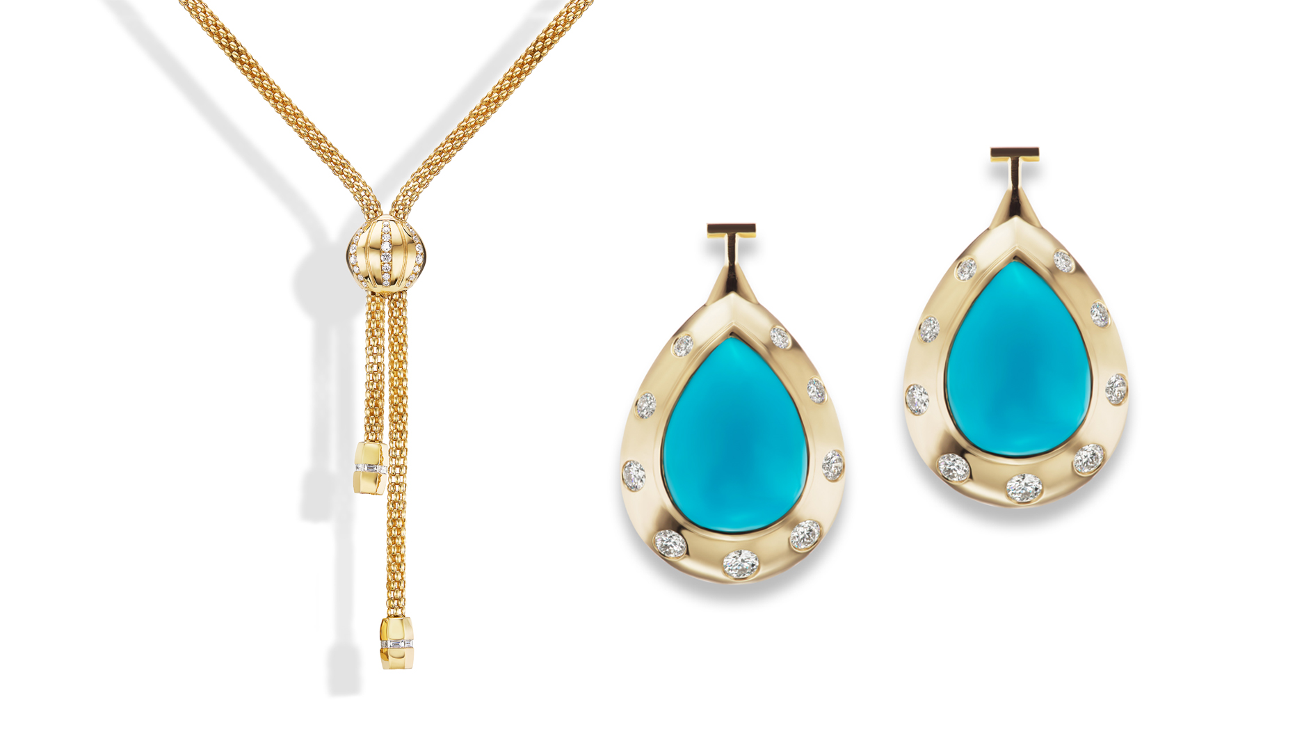 But its perfect summertime accoutrement are drops also rendered in 18-karat gold and featuring 16.3 carats of turquoise, as well as 1 carat of diamonds on the bezel settings.