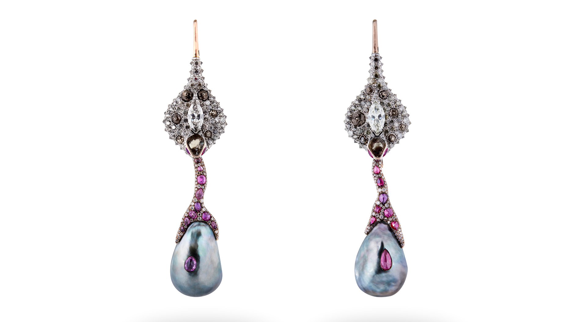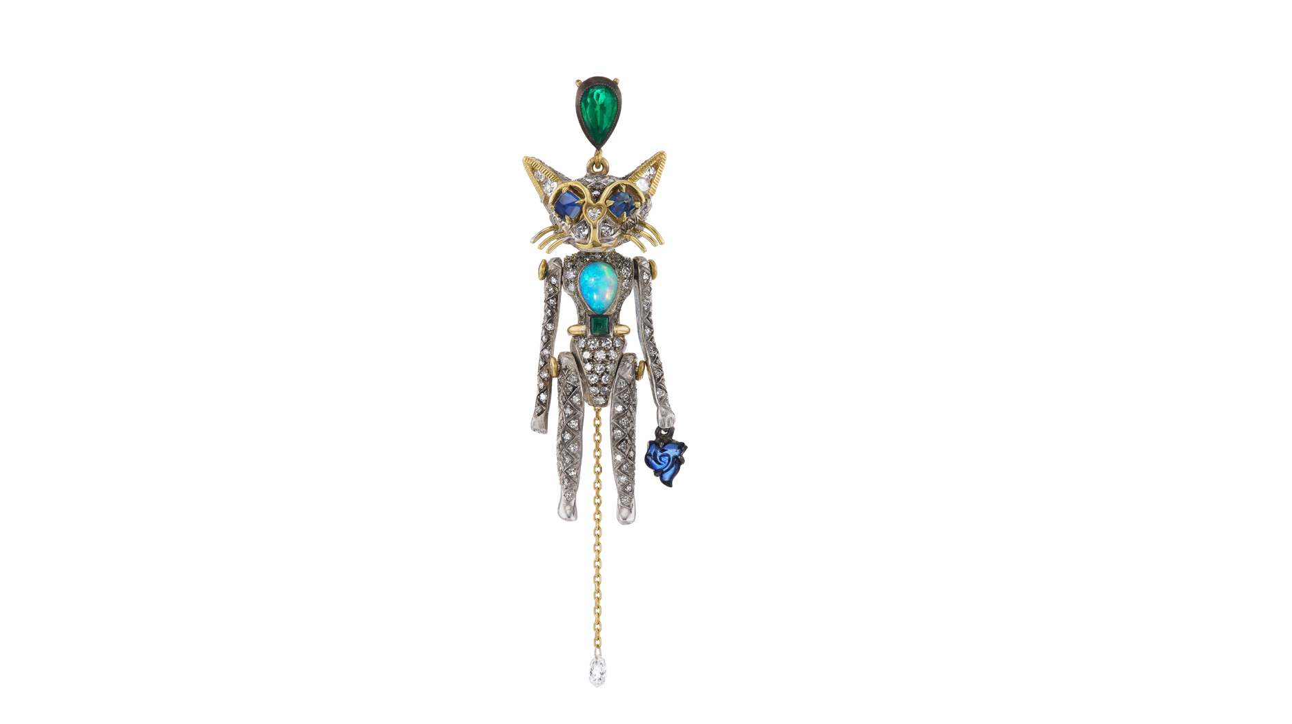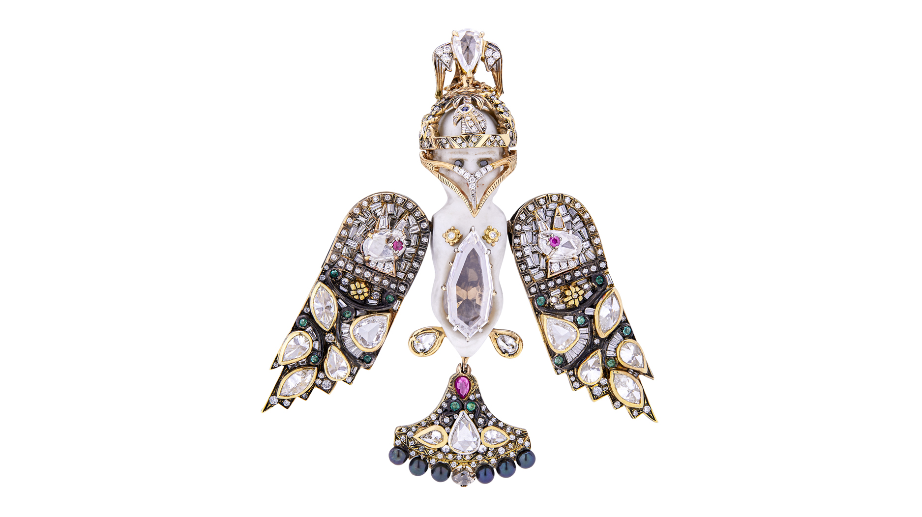 Castro’s “Antique Bisque Doll” was presented at Sotheby’s New York’s “Brilliant & Black” sale in September 2021. Handmade in Geneva, it took 600 hours to make and was realized over two years. The pendant’s shield wings vibrate in the style of “en tremblant” jewelry. The bird’s mask opens and closes and can be removed to show the antique doll’s face. Featuring enamel, emeralds, rubies, Akoya pearls, and diamonds in 18-karat gold and sterling silver, the piece’s largest stones are a 1.5-carat Type IIa diamond and a 2.83-carat brown diamond.
