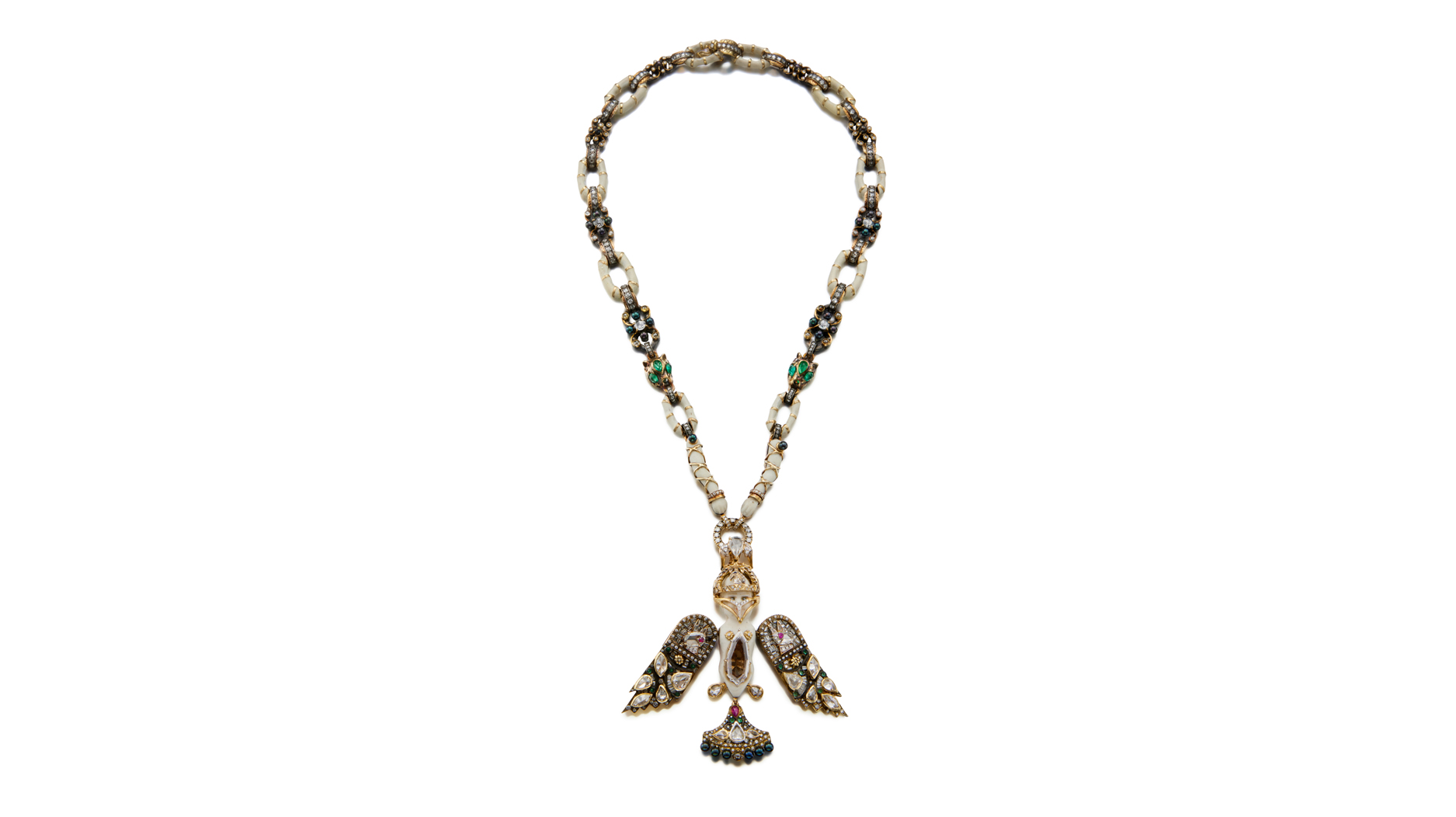 The design transformed an antique doll into a pendant replete with vibrating bejeweled wings and a bird mask in the vein of his many skeleton-inspired pieces.