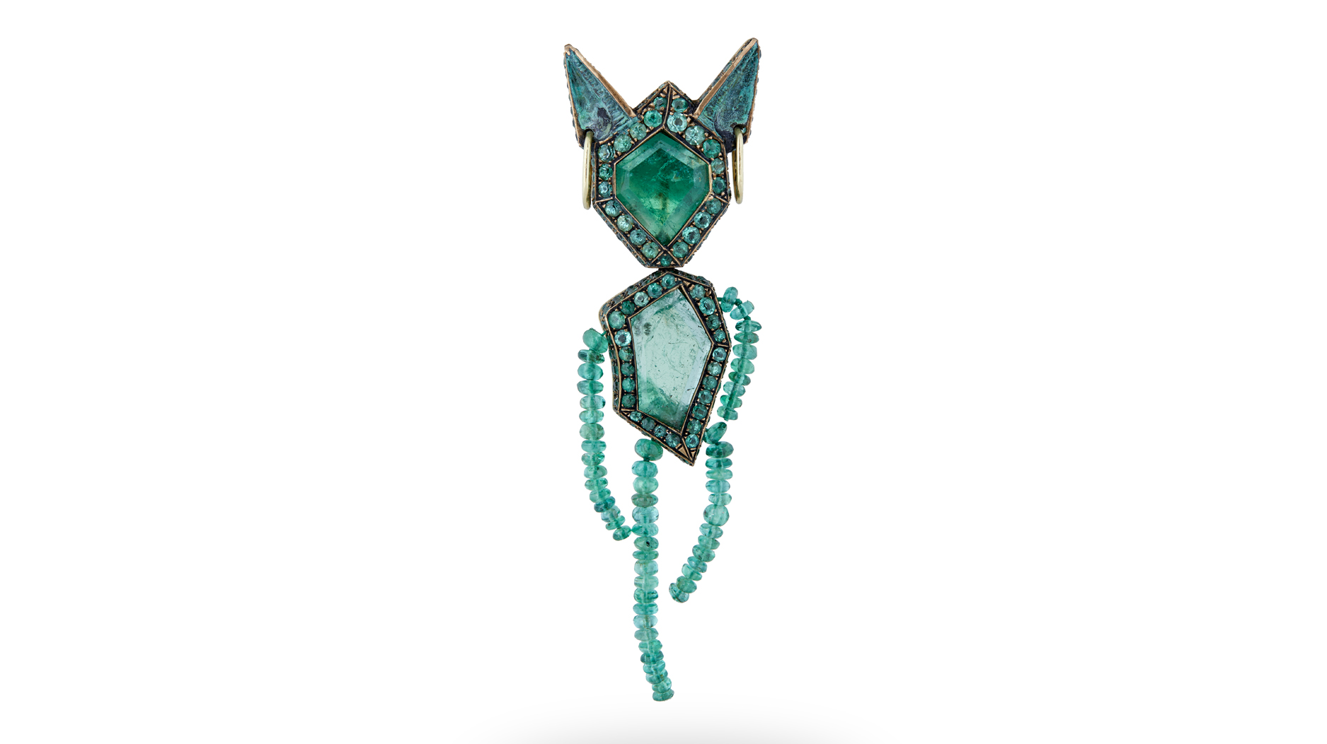 Castro’s “Money Brooch” pendant, featuring Muzo emeralds, was also presented at Sotheby’s “Brilliant & Black” exhibition. (Image courtesy of Sotheby’s)