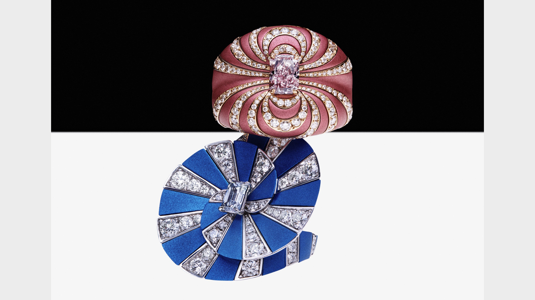 The pink ring made of aluminum and 18-karat rose gold features a 1.01-carat radiant-cut fancy intense pink diamond. The blue ring in aluminum and 18-karat white gold has a 0.5-carat emerald-cut fancy intense blue diamond.
