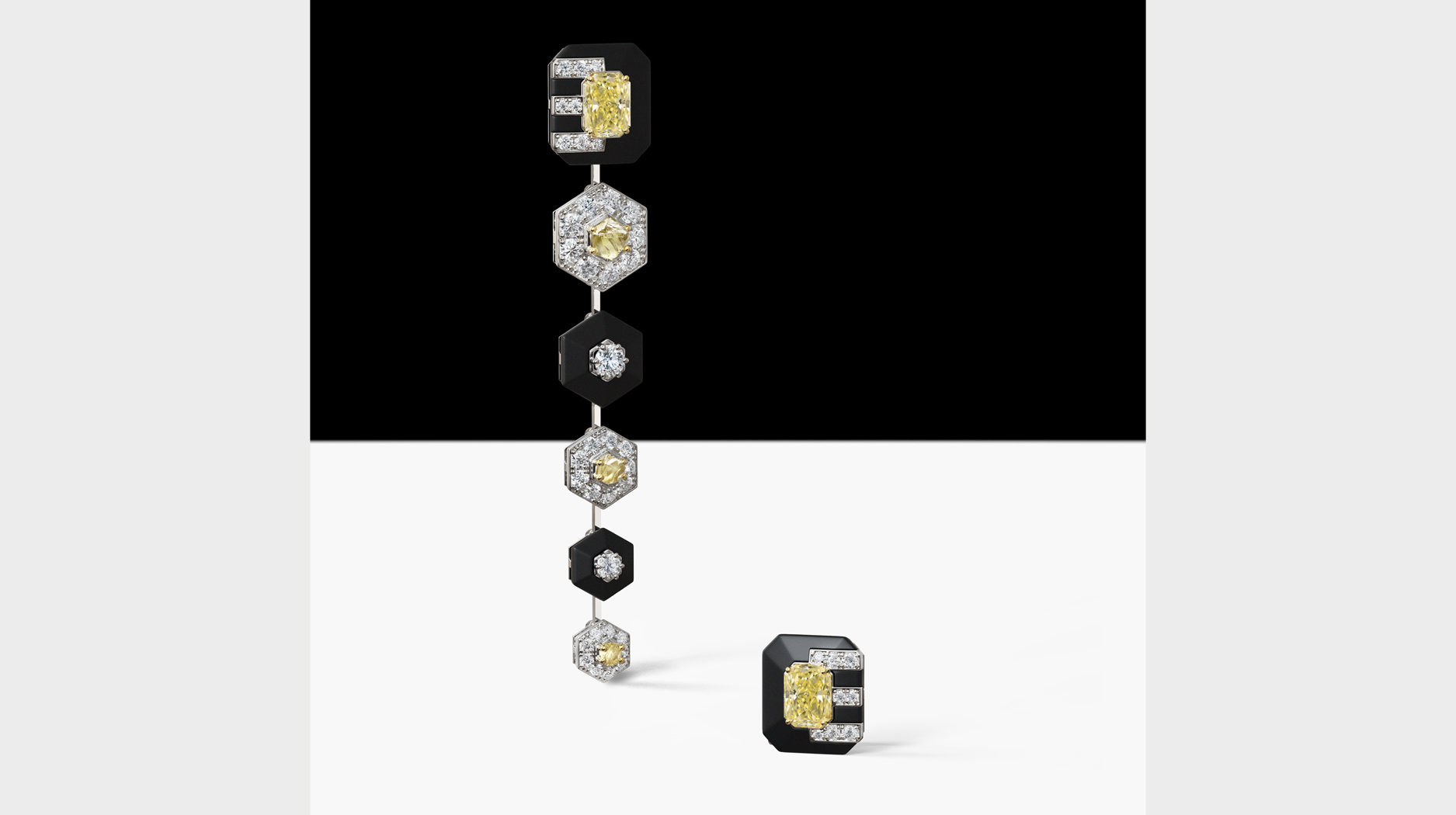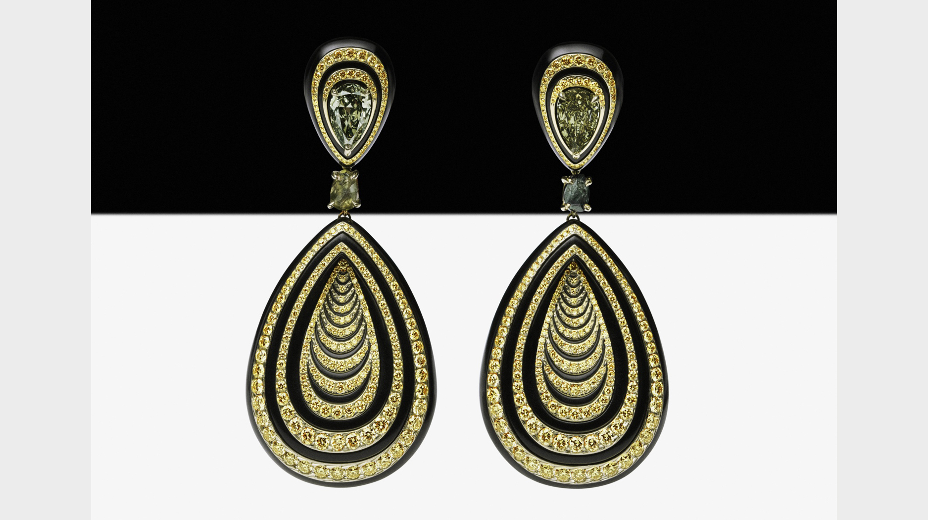 A pair of matching earrings, meanwhile, feature a mesmerizing concentric circle pattern thanks again to black aluminum and yellow diamonds.